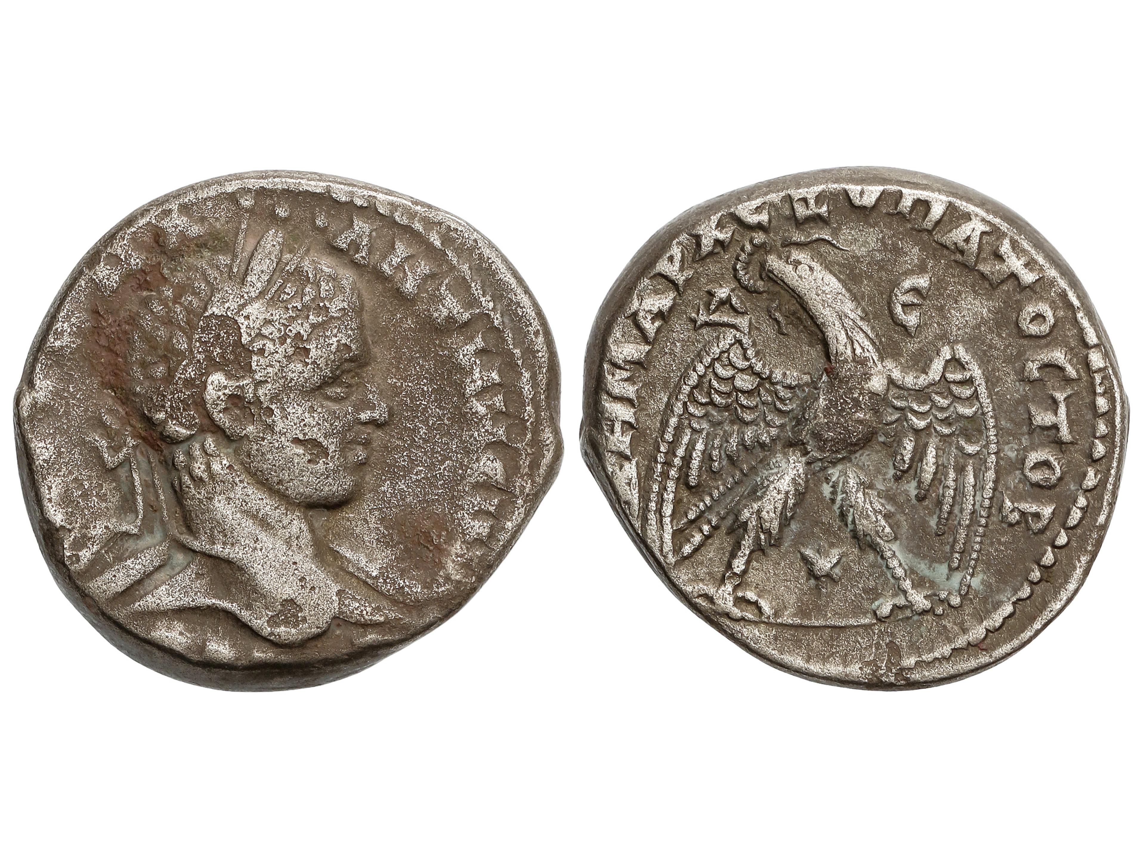 15 imageTetradracma. 218-222 d.C. HELIOGÁBALO. ANTIOQUÍA. Anv.: Busto laureado a derecha, alrededor leyenda. Rev.: Águila en pie de frente, cabeza a izquierda, debajo estrella, alrededor leyenda. 15,46 grs. Ve. (Oxidaciones). Prieur-249. BC+/MBC-. (Image1)