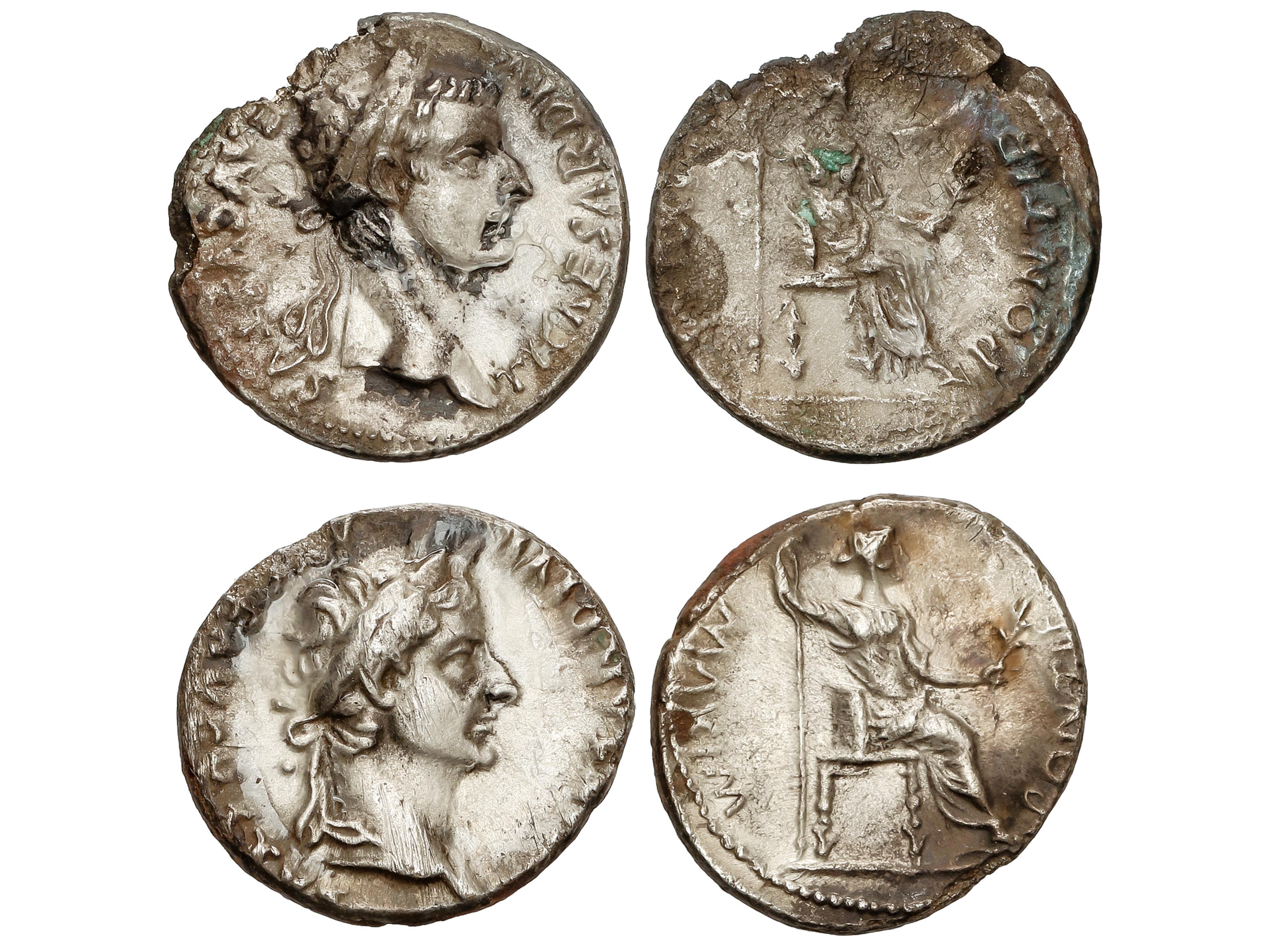 8 imageLote 2 monedas Denario. 14-37 d.C. TIBERIO. Anv.: TI. CAESAR DIVI AVG. F. AVGVSTVS. Cabeza laureada de Tiberio a derecha. Rev.: PONTIF. MAXIM. Livia sentada a derecha en silla ornamentada. 2,96,3,65 grs. AR. (Roturas y cristalizadas). A EXAMINAR. C-16; RIC-30. BC- a MBC-. (Image1)