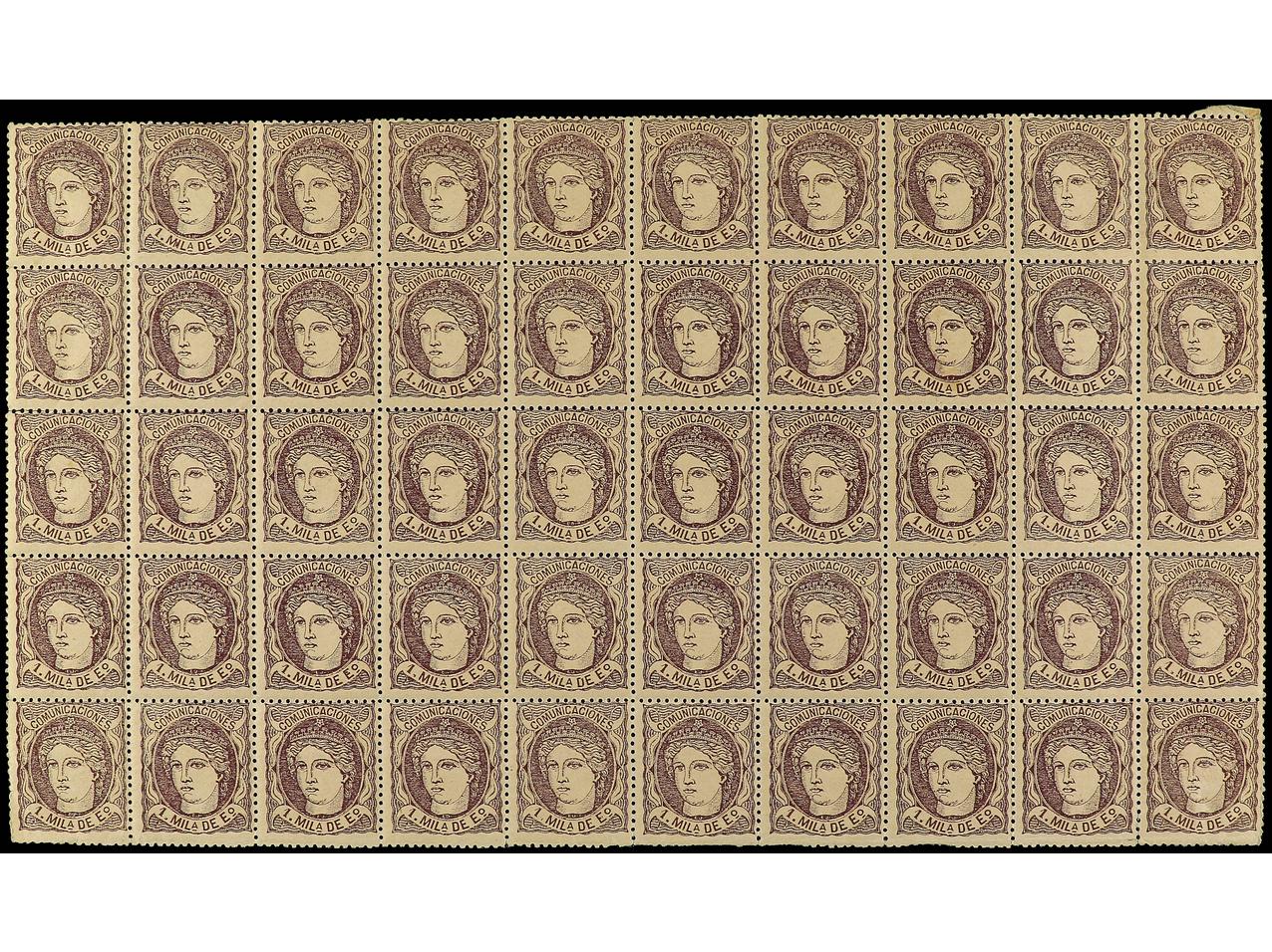 ESPAÑA. 50 mils. violeta. Conjunto de 50 sellos en bloques y tiras de diversos tamaños, diferentes tonos de color. Excelente calidad, todas sin fijasellos. Ed.98 (50). Cat. 1.300€. (Image1)