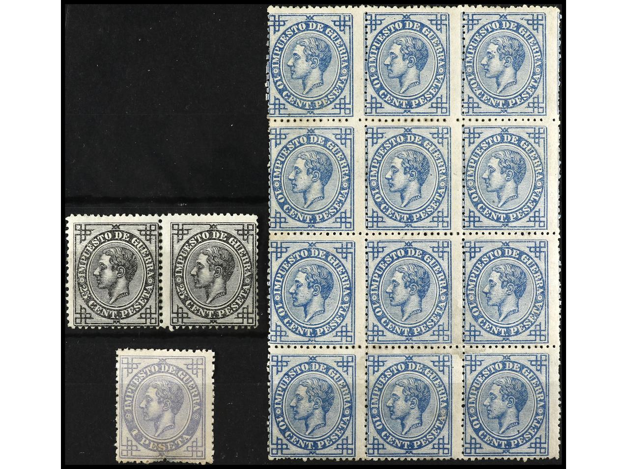 ESPAÑA. 10 cts. azul, 12 sellos, 25 cts. negro 2 sellos y 1 pta. gris. Defectos. Ed.184 (12), 185 (2), 186. Cat. 590€. (Image1)