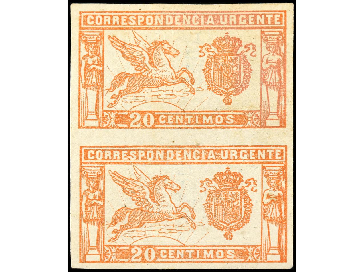 ESPAÑA. 20 céntimos urgente, nº A.059.785, pareja SIN DENTAR (posible pareja sin dentar en medio y dientes recortados). Pliegue en sello superior. RARO. Ed.256.