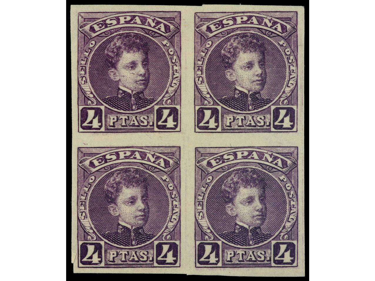 ESPAÑA. 4 pts. violeta. PRUEBA en bloque de 4 SIN DENTAR. PRECIOSA. MUY RARA. Ed.254P(4). (Image1)