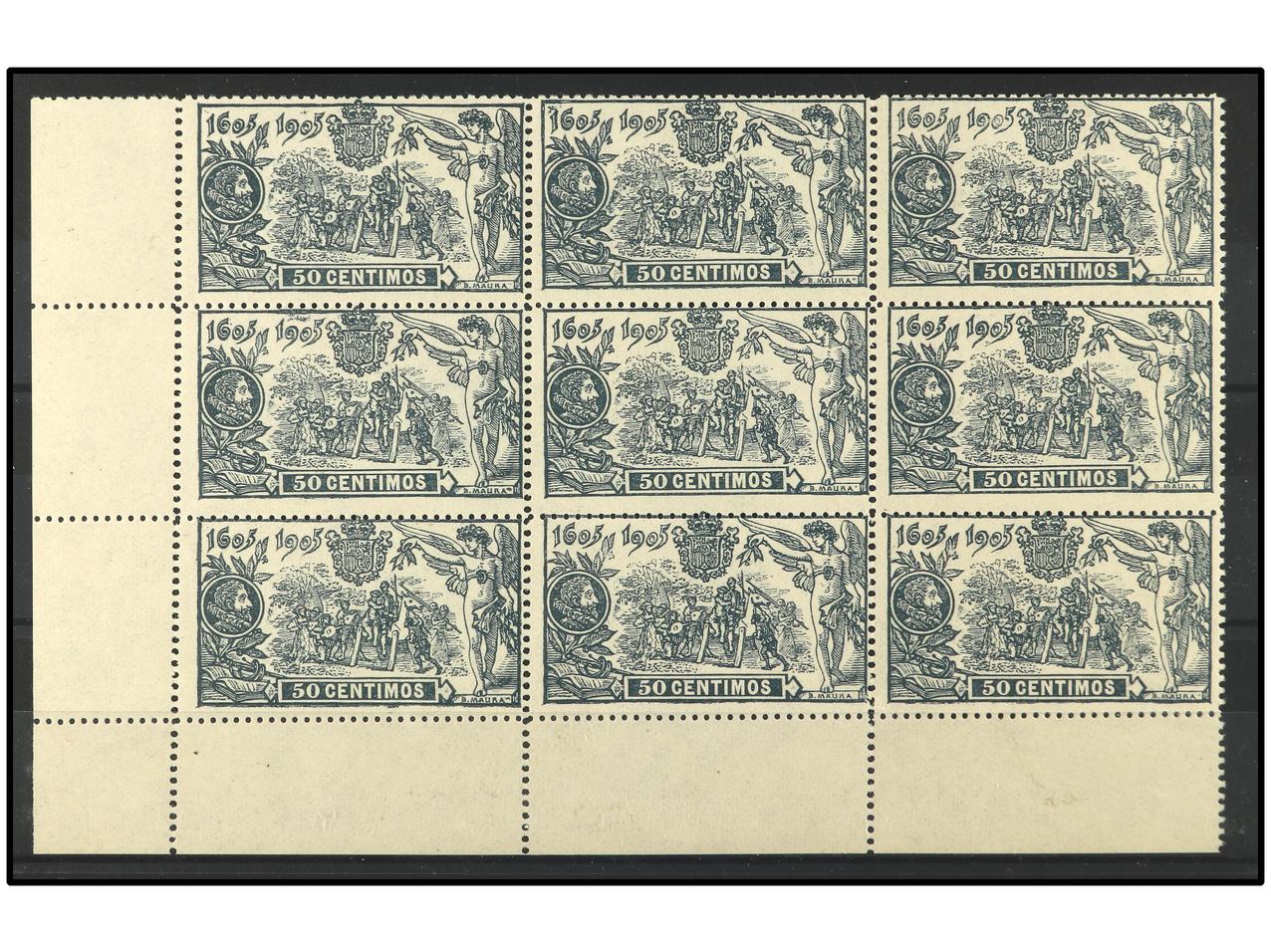 ESPAÑA. 50 cts. azul grisáceo en bloque de 9. Esquina de pliego. BONITO. RARO. Ed.263(9). Cat. 594€. (Image1)