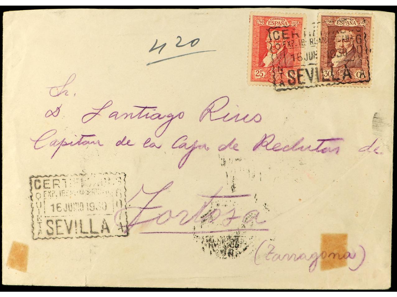 ESPAÑA. 3 Piezas: Carta circulada a TARRAGONA con sellos de 25 y 30 cts. , sobre con 5 cts. con Mat. VAPOR CORREO ESPAÑOL/ ALCANCE y sobre con sellos 10, 25 cts. y 1 pta. SIN DENTAR con matasellos de la exposición. OCASIÓN. (Image1) (Image2)