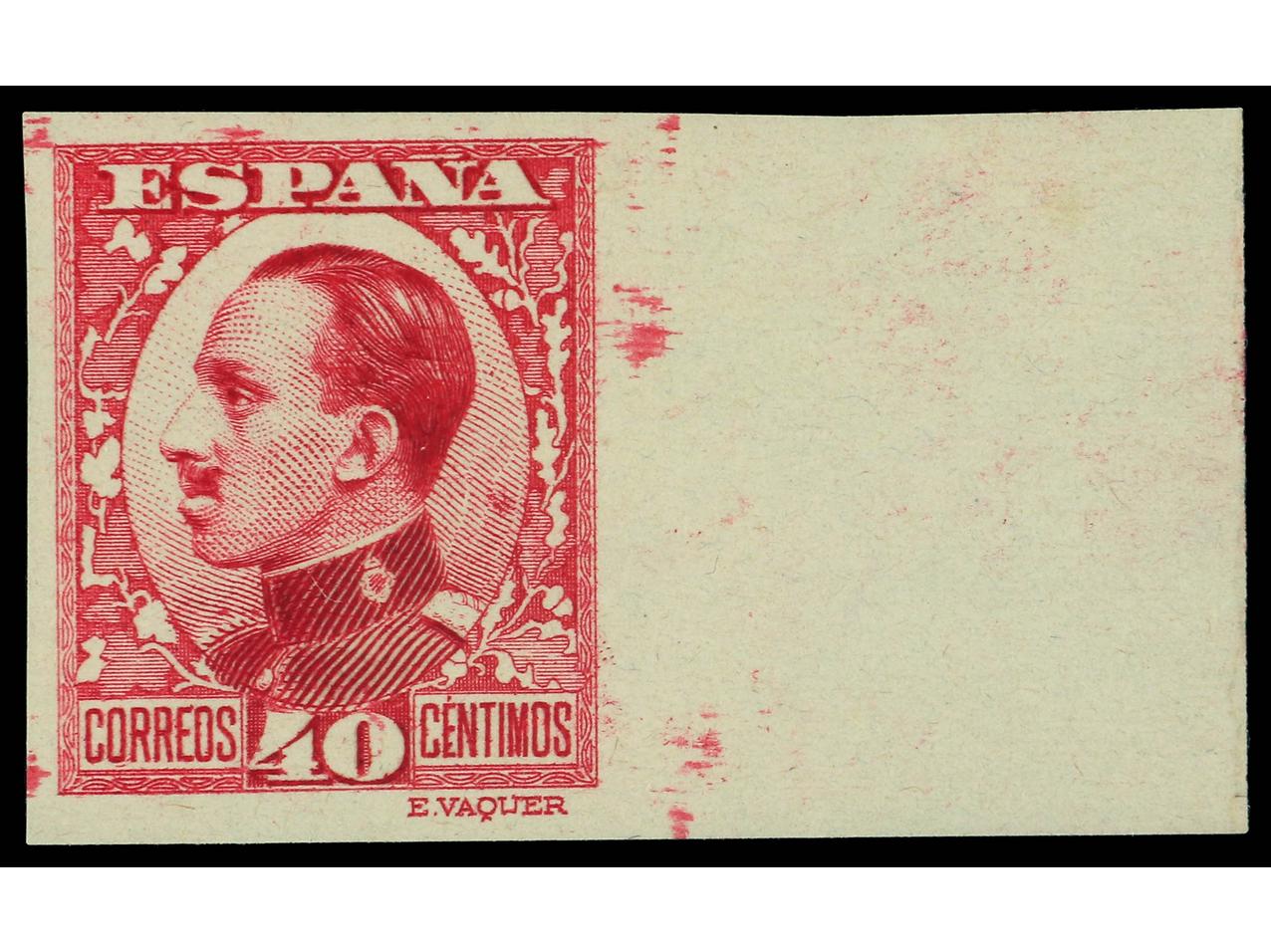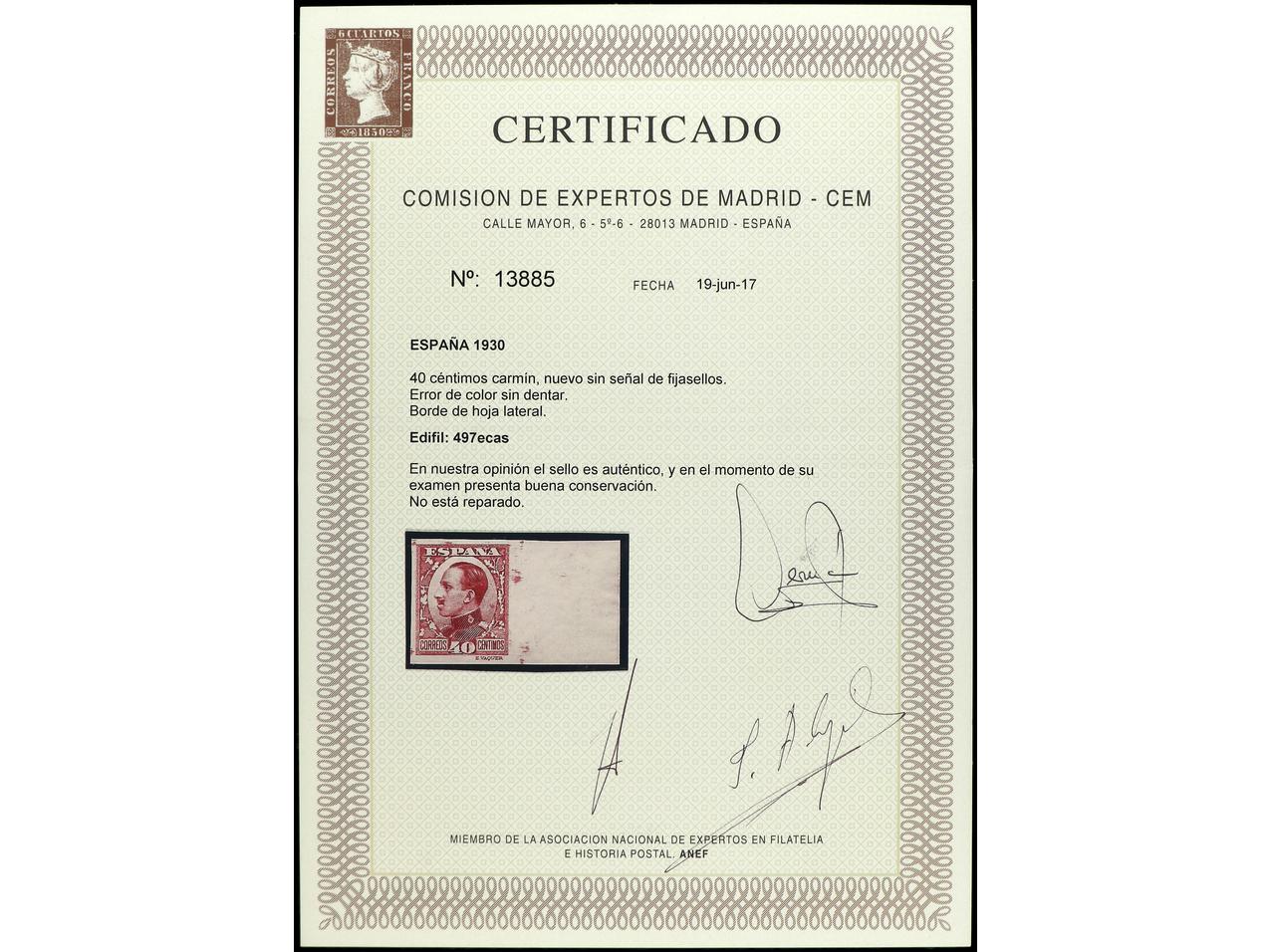 ESPAÑA. 40 cts. carmín SIN DENTAR. ERROR DE COLOR. Borde lateral de hoja. Cert. CEM. PRECIOSO. MUY RARO. Ed.497ecas. (Image1) (Image2)