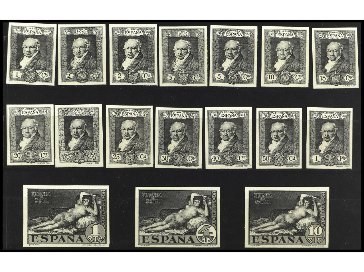 ESPAÑA. Goya 1 cto. a 1 pta. más 1, 4 y 10 pts. de la Maja en NEGRO SIN DENTAR, estos últimos no catalogados en Gálvez de pruebas. Cert. CEM. Precioso conjunto. MUY RARO. Ed.499P/515P. (Image1) (Image2)