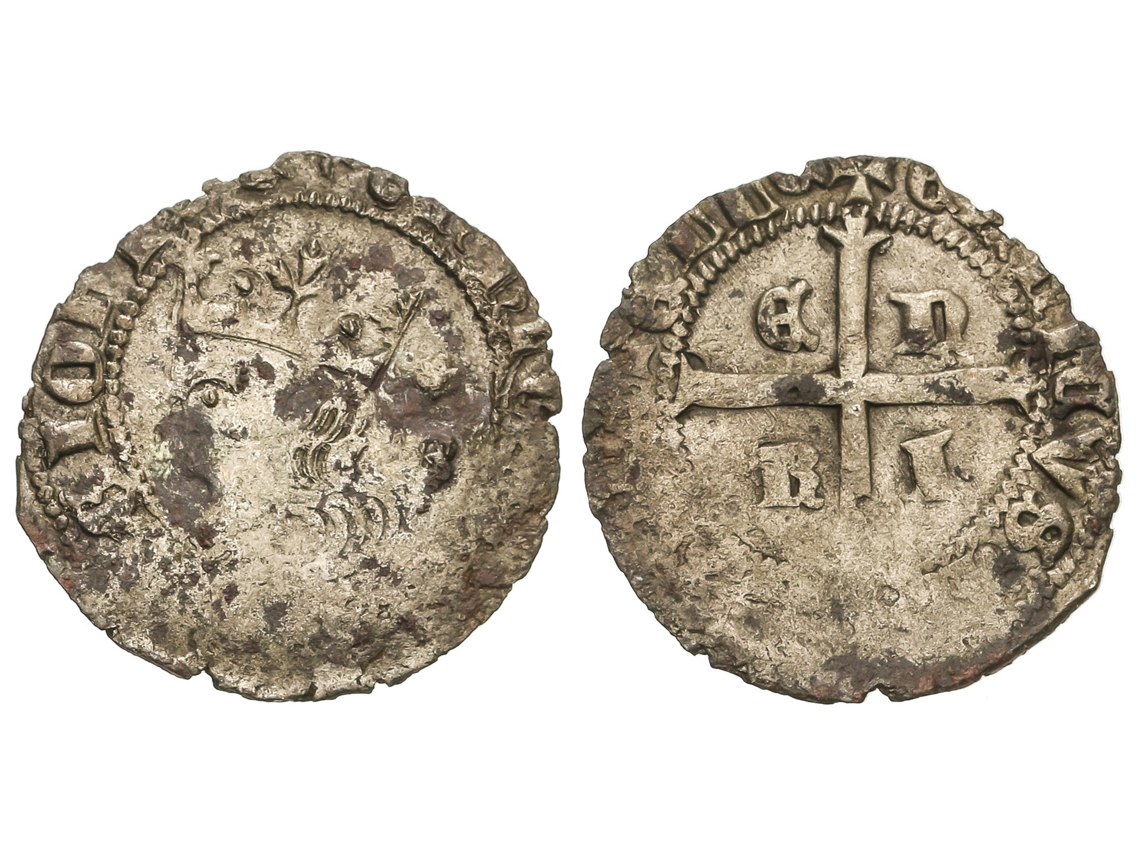 1/2 Cuartillo. ENRIQUE IV. SEVILLA. Rev.: ENRICVS CARTVS DEI G. S debajo del castillo. 1,41 grs. Ve. FAB-780.1. MBC.