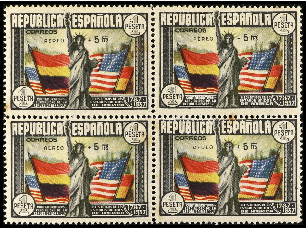 ESPAÑA. Aéreo + 5 pts. multicolor. Bloque de cuatro, manchas del tiempo. Ed.765. Cat. 2.400€. (Image1)