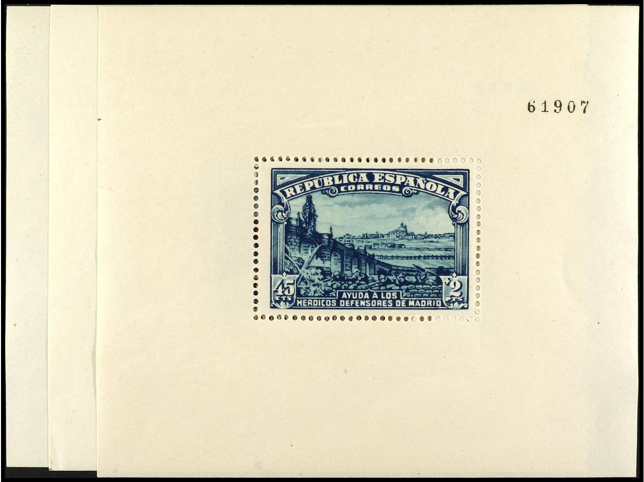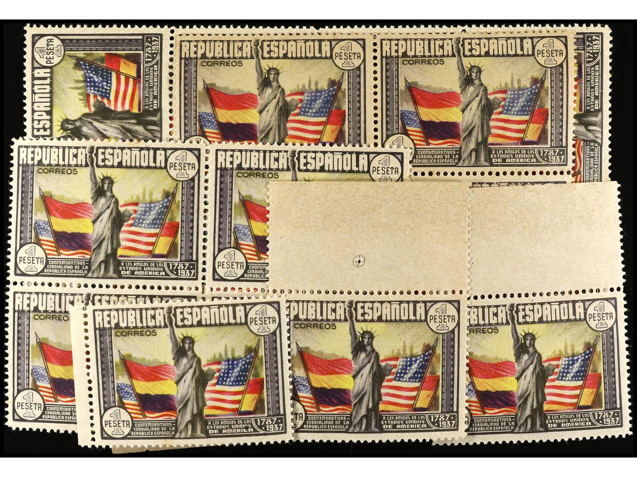 ESPAÑA. 45 cts. + 2 pts. azul. Conjunto de 50 sellos SIN DENTAR y con el color azul cielo desplazado. En grandes bloques. Ed.757s. Cat. +1.100€.