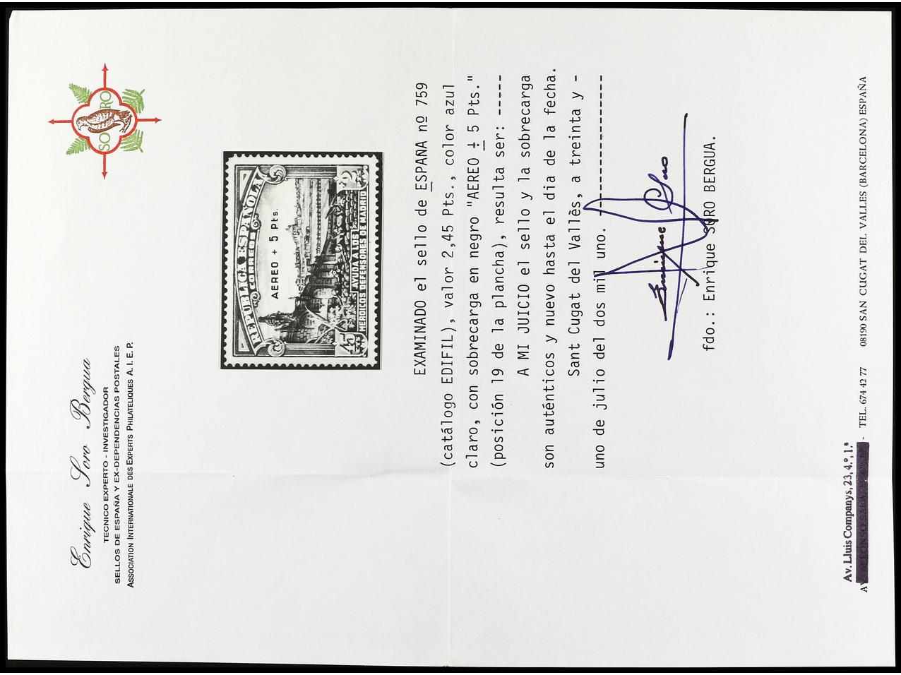 ESPAÑA. Aéreo + 5 pts. Tipo 19. Centrado de lujo. Goma no original. Cert. SORO. Ed.759. (Image1) (Image2)