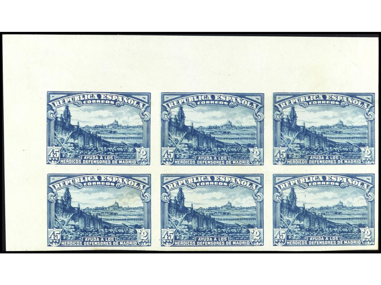 ESPAÑA. 45 cts. + 2 pts. azul en bloque de 6 SIN DENTAR. Esquina de pliego. PRECIOSO. RARO. Ed.757s(6). Cat. 132€. (Image1)