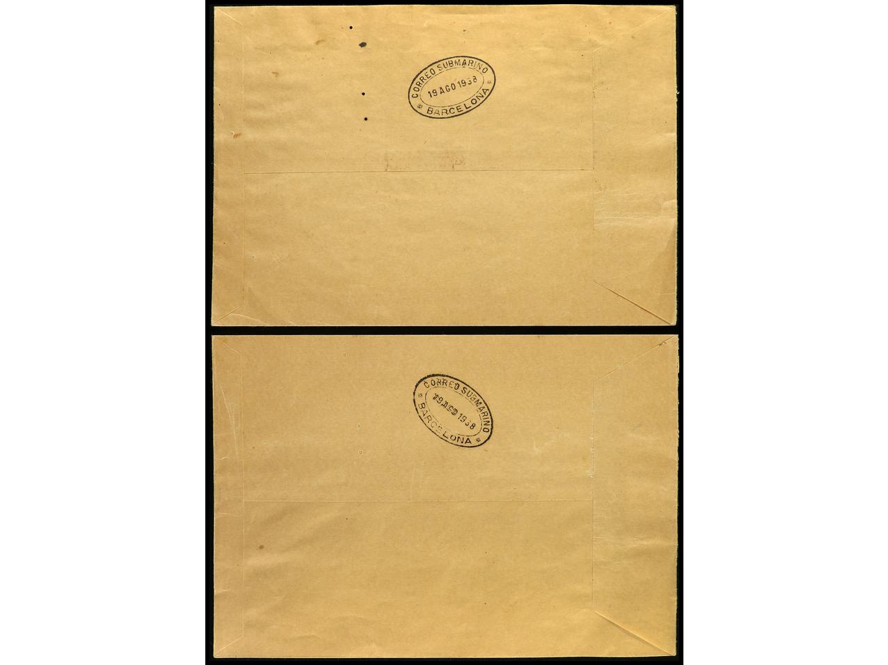 ESPAÑA. HB. Dos cartas de MAHÓN a BARCELONA, manchas del tiempo (en una fuertes) y dos agujeros de polilla. Ed.781 (2). (Image1) (Image2)