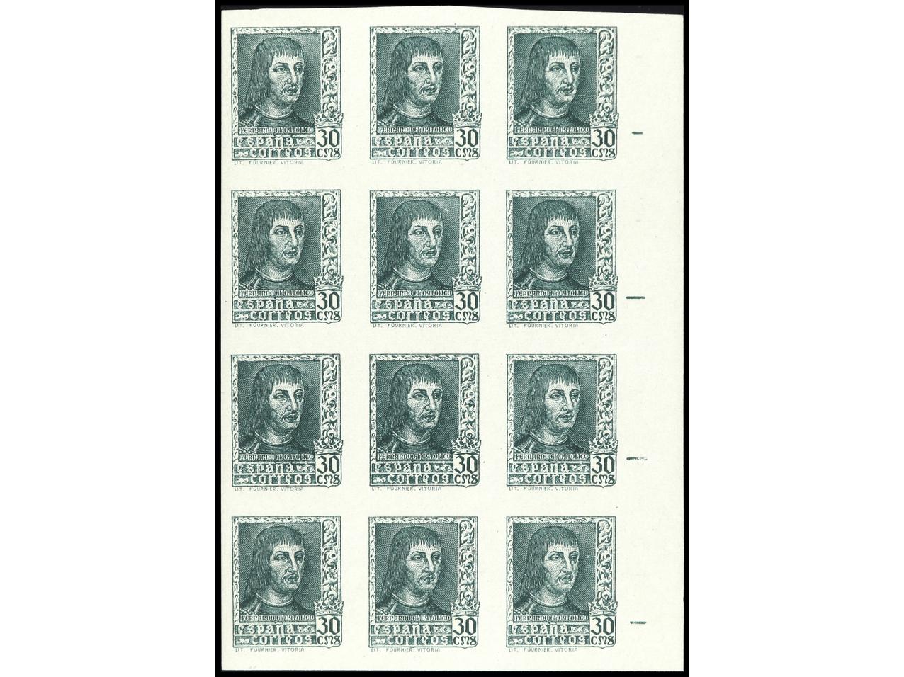 ESPAÑA. 30 ´CMS´ verde en bloque de 12 SIN DENTAR. COLOR CAMBIADO. Borde lateral de hoja. OCASIÓN. Ed.844Aecc(12). Cat. 2.160€. (Image1)