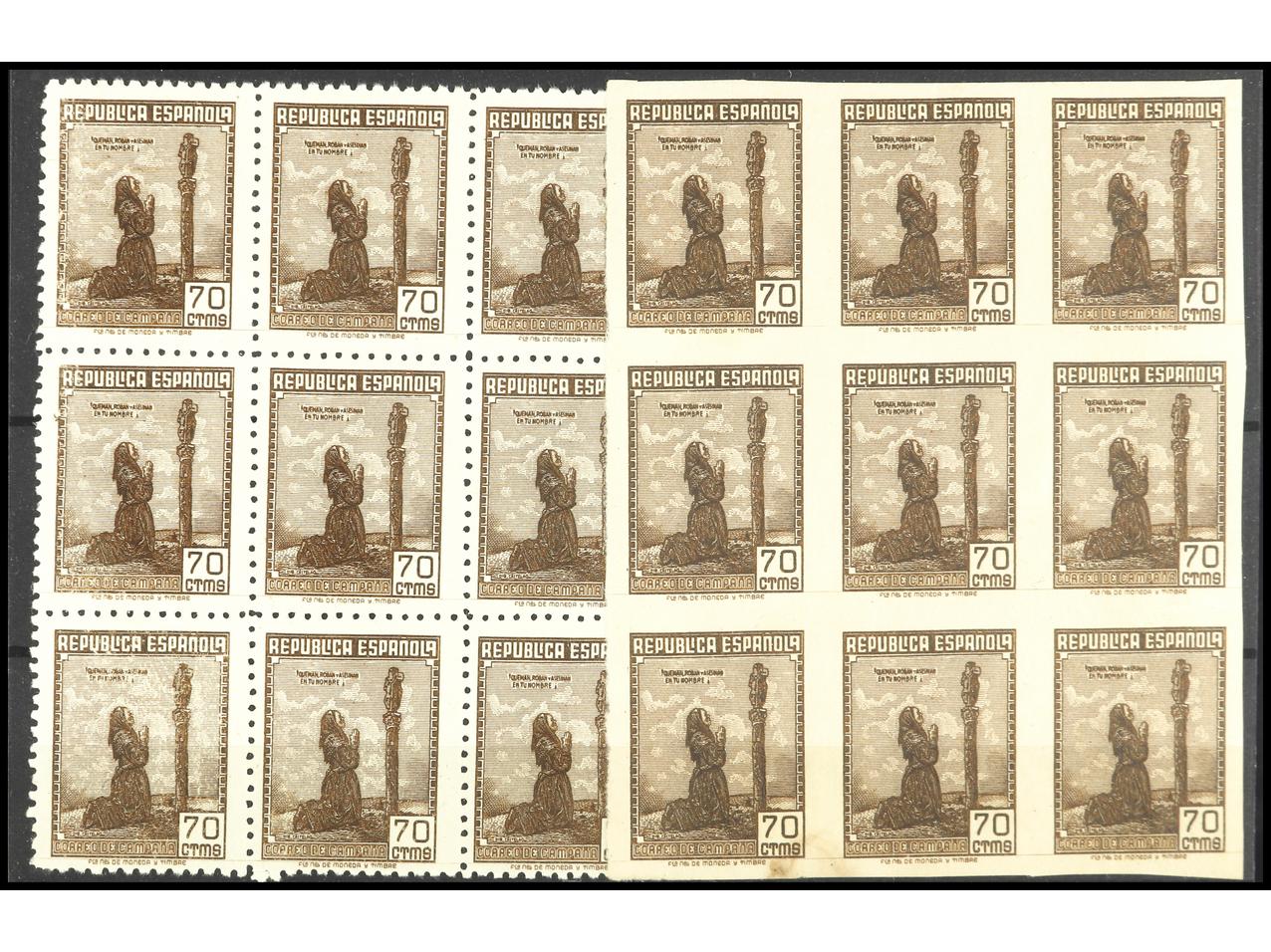 ESPAÑA. 70 cts. castaño. 2 Bloques de 9 (dentado y SIN DENTAR). OCASIÓN. Ed.NE52(9) y NE52s(9). Cat. 648€. (Image1)