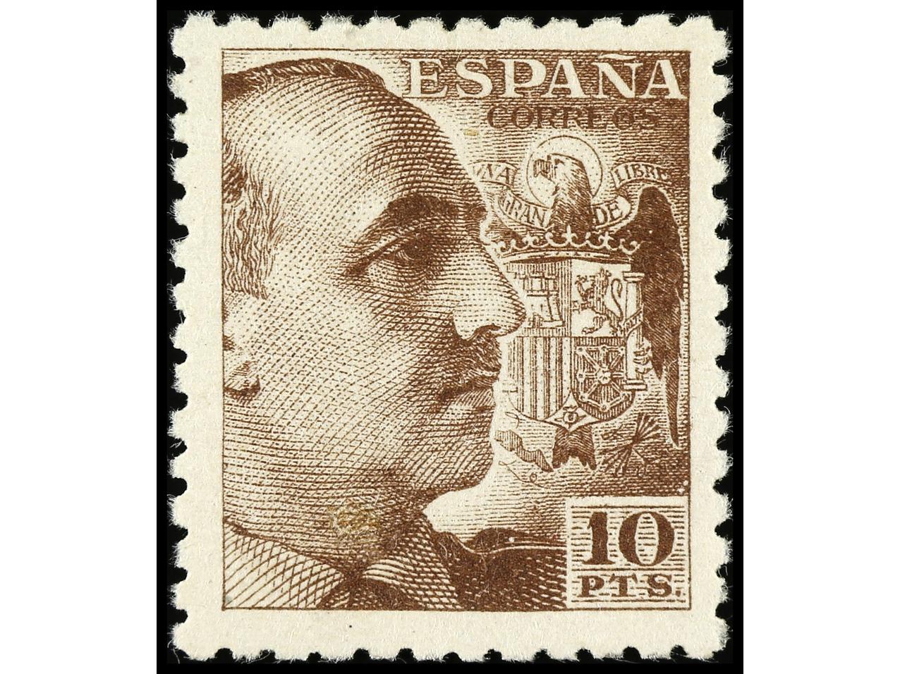 ESPAÑA. 1 pta. castaño. 4 Sellos con defectos de plancha diferentes: LAURELES DERECHO e IZQUIERDO ROTOS, ´U´ DE JULIO ROTA y PRIMERA ´R´ DE CORREOS ROTA. RAROS. OCASION. A EXAMINAR. Ed.854/(4). (Image1)