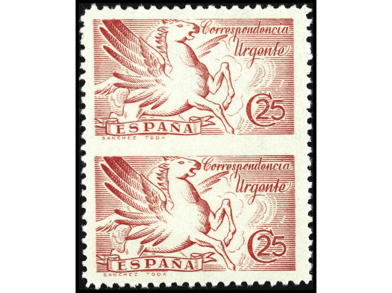 ESPAÑA. 25 cts. rojo en pareja horizontal SIN DENTAR POR EL CENTRO. PRECIOSA. RARA. Ed.879spv. (Image1)