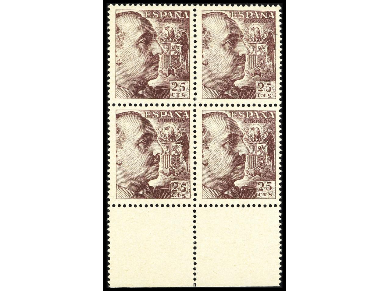 ESPAÑA. 25 cts. lila oscuro en bloque de 4 con borde inferior de hoja. MUY BONITO. Ed.1048A(4). (Image1)