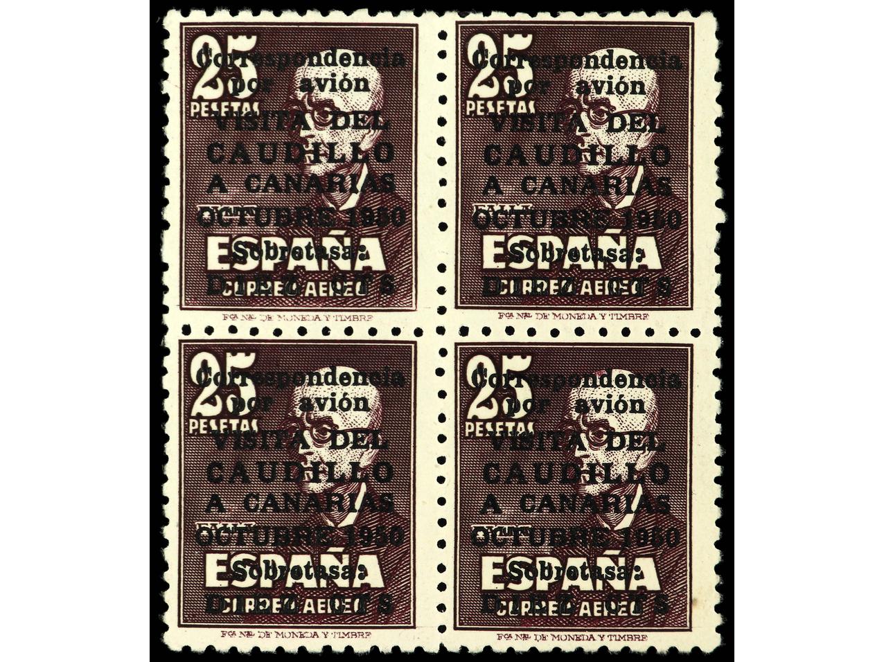 ESPAÑA. CAUDILLO A CANARIAS CON NÚMERO. Bloque de 4. Sello inferior derecho ínfima manchita del tiempo en esquina. Cert. COMEX. RARO. OCASION. Ed.1090(4). Cat. 4.240€. (Image1) (Image2)