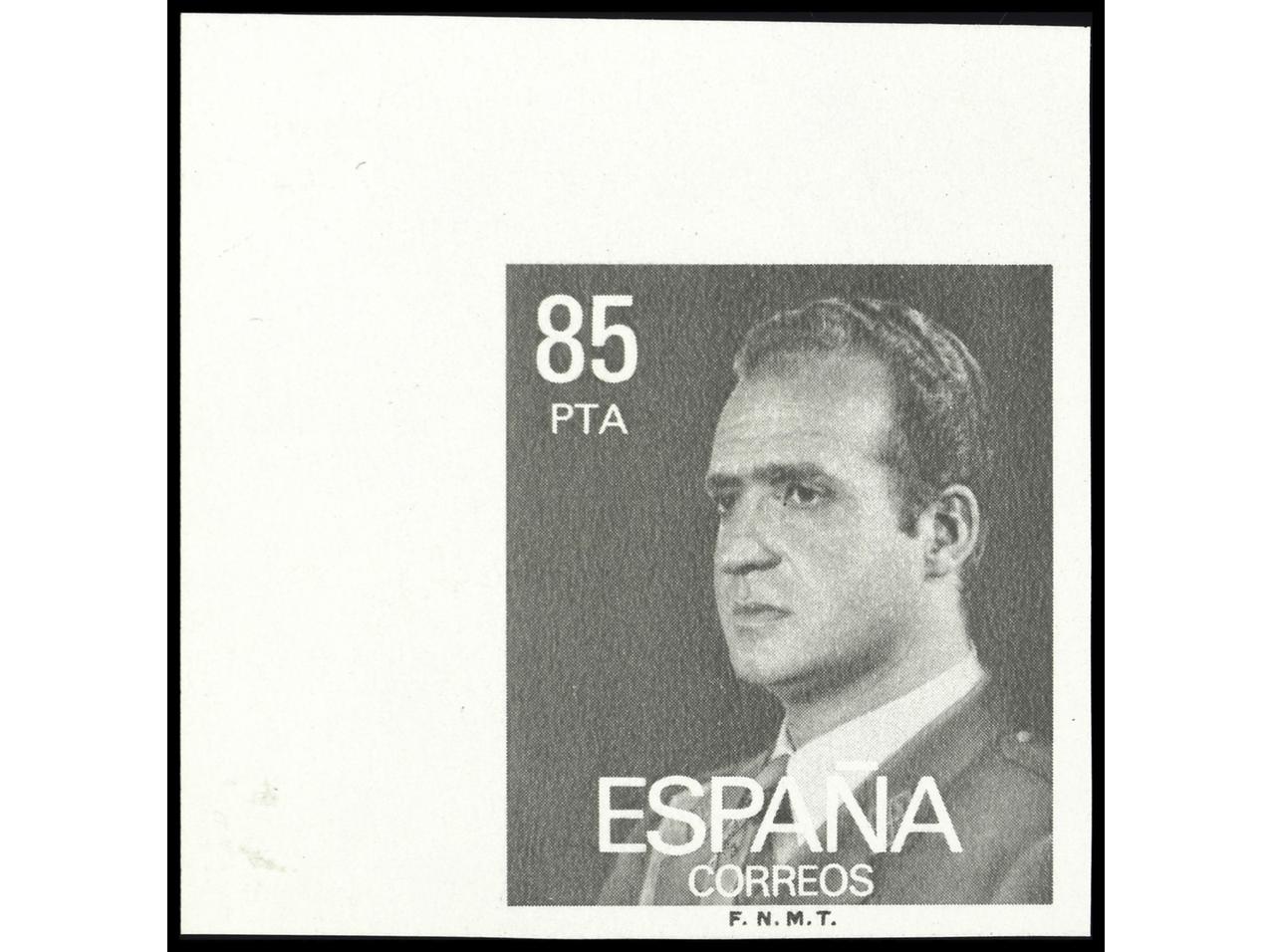 ESPAÑA. JUAN CARLOS I. 85 pts. gris SIN DENTAR. Excepcional sello ya que fue el único esquina de pliego posible procedente del pliego parcialmente dentafo, del cual no salieron más de una docena de sellos totamnente sin dentar. Cert.