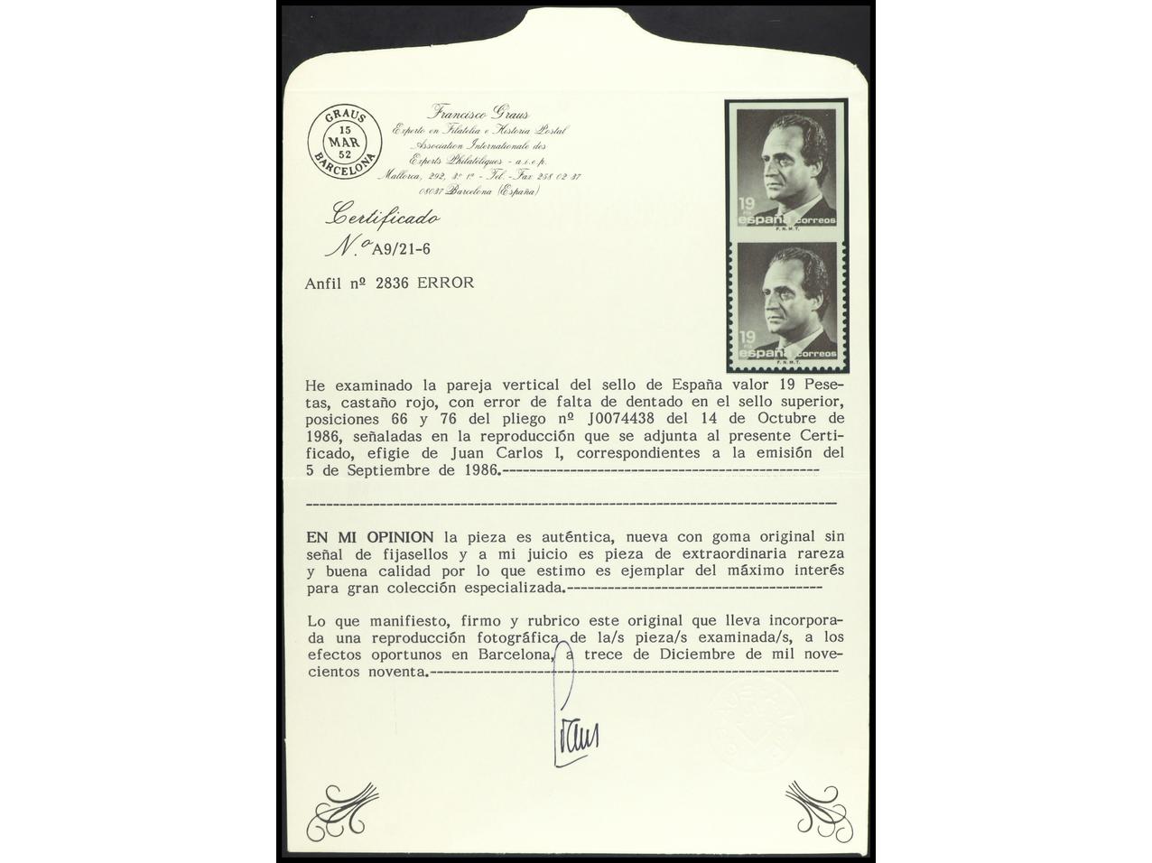 ESPAÑA. JUAN CARLOS I. 19 pts. castaño rojo SIN DENTAR. Fantástica pieza. Una de las 10 conocidas procedente de un pliego en el que quedó una banda central (10 sellos) sin dentado. Cert. GRAUS. GRAN OCASIÓN. Ed.2834s. (Image1) (Image2)