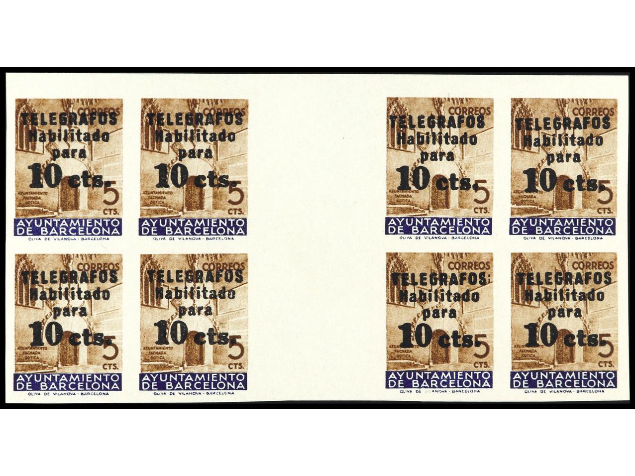 ESPAÑA: AYUNTAMIENTO DE BARCELONA. TELÉGRAFOS. 10 cts. s. 5 cts. castaño y azul. Bloque de 8 SIN DENTAR con INTERPANEL. No catalogado. MUY BONITO. RARO. Ed.T.9s(8). Cat. 1.120€. (Image1)