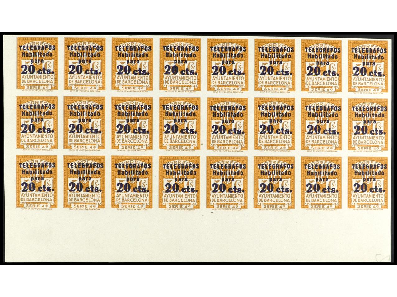 ESPAÑA: AYUNTAMIENTO DE BARCELONA. TELÉGRAFOS. 20 cts. s. 5 cts. naranja. 4 Bloques de 24 SIN DENTAR. Buena calidad. OCASIÓN. Ed.T.11s(96). Cat. 8.832€.