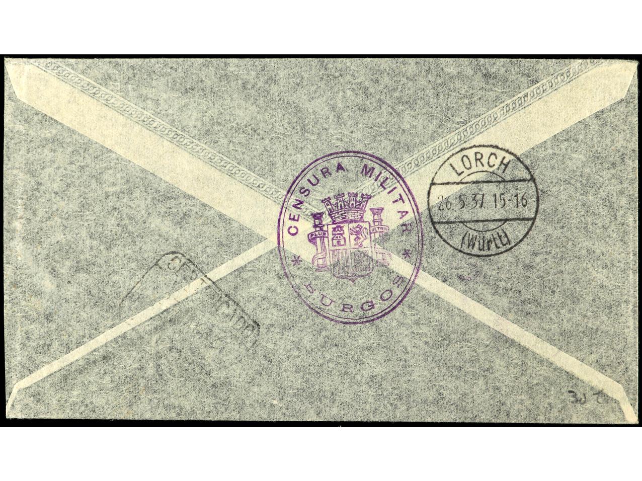1636 c imageESPAÑA E. LOCALES PATRIOTICAS: LUGO. Carta certificada por avión de PONTEVEDRA a LORCH (ALEMANIA). Espectacular franqueo. MUY RARA. Ed.11, 12.... (Image1) (Image2) (All Images)