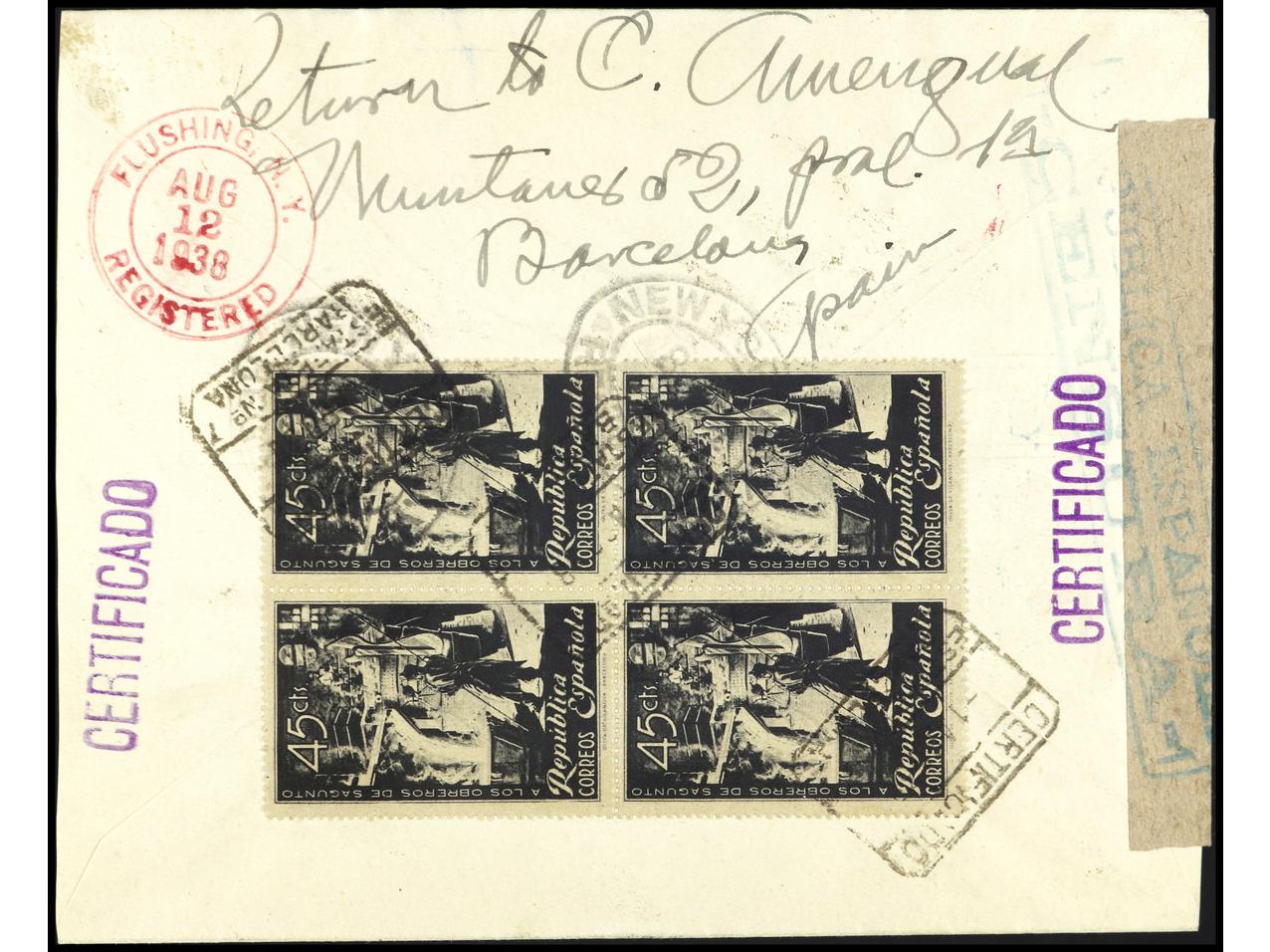 1638 c imageESPAÑA E. LOCALES PATRIOTICAS: MALAGA. Carta certificada por avión de MÁLAGA a LONDRES franquedada con 3 sellos de 50 cts. con HAB. DOBLE. MUY RARA. Ed.45hh. (Image1)