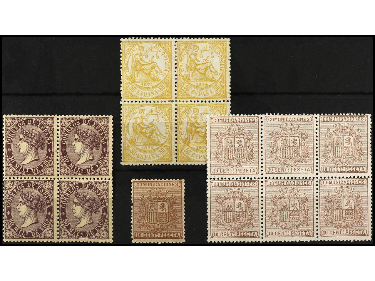 1678 imageLOTES y COLECCIONES. ESPAÑA. Tres páginas de álbumes con bloques y fragmentos de las emisiones de 1867-70. INTERESANTE CONJUNTO. (Image1) (Image2) (Image3) (All Images)