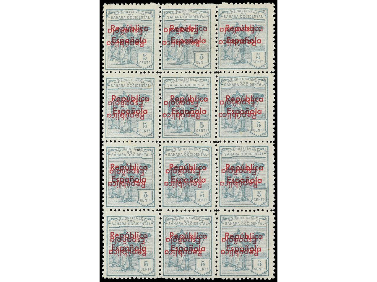 COLONIAS ESPAÑOLAS: SAHARA. 5 cts. verde claro. Bloque de 12 con HABILITACIÓN DOBLE, UNA INVERTIDA. En general buena calidad. EXAMINAR. Ed.36Bhhi (12). Cat. 1.500€. (Image1)