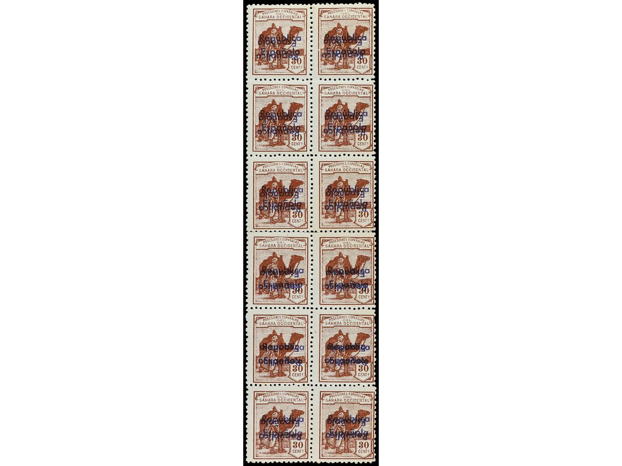 COLONIAS ESPAÑOLAS: SAHARA. 30 cts. castaño rojizo. Bloque de 12 con HABILITACIÓN DOBLE, UNA INVERTIDA. Buena calidad. Ed.41Bhhi (12). Cat. 1.500€.