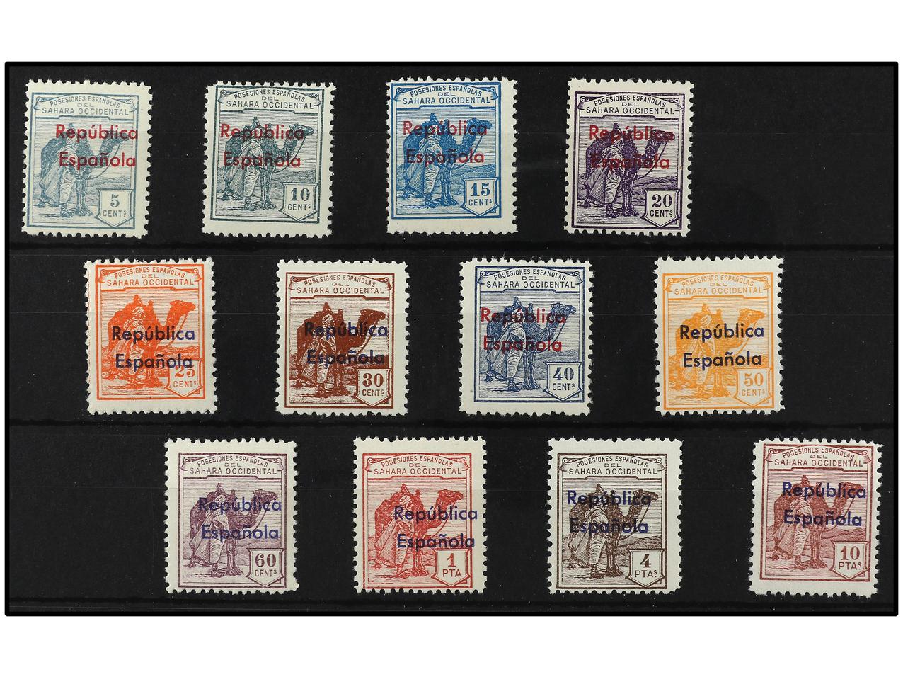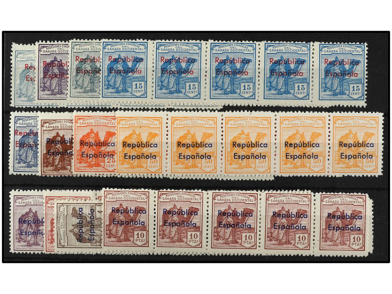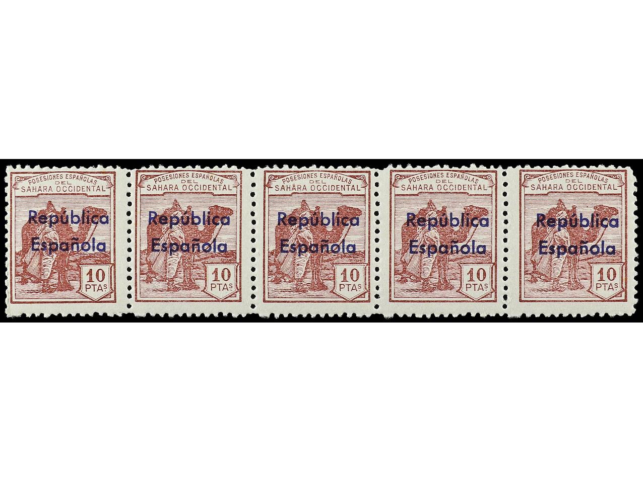 COLONIAS ESPAÑOLAS: SAHARA. SERIE COMPLETA, 12 valores. Habilitación horizontal. 5 series en tiras, a falta de 1 sello de 5 c. Ed.36B/47B. Cat. 2.775€.