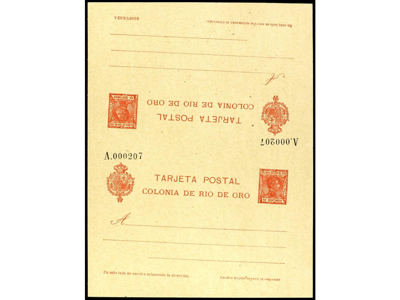 COLONIAS ESPAÑOLAS: RIO DE ORO. ENTERO POSTAL DOBLE. 10 + 10 cts. carmín, 20 enteros sin doblar, alguna mínima sombra del tiempo. Ed.4. Cat. 5.500€.
