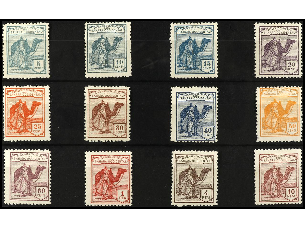 COLONIAS ESPAÑOLAS: SAHARA. SERIE COMPLETA, 12 valores. 20 cts. y 50 cts. de poco valor, ínfimo defecto. Valores clave de lujo. A EXAMINAR. Ed.1/12. Cat. +350€.