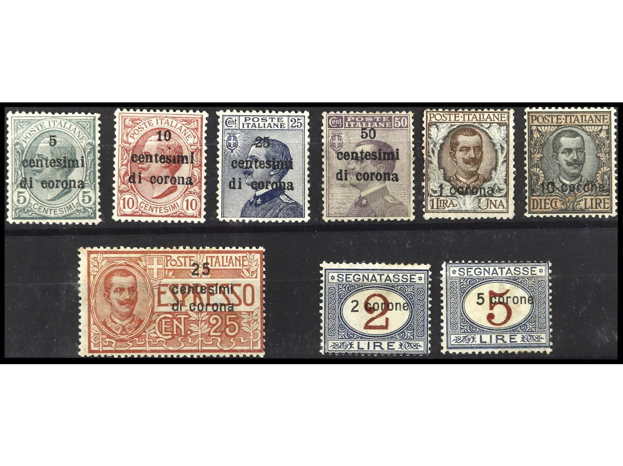 2448 nh/og imageCOLONIAS ITALIANAS. DALMACIA. 9 Sellos diferentes (6 de correo, 1 de tasas y 2 urgentes). A EXAMINAR. Yv.1/5, 7, U.1 y T.3/4. Yvert.205€. (Image1)