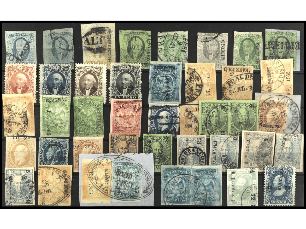 2469 ° imageMEXICO. 1856-1872. Ficha grande conteniendo 42 sellos clásicos de varias emisiones con diversos matasellos. A EXAMINAR. (Image1)