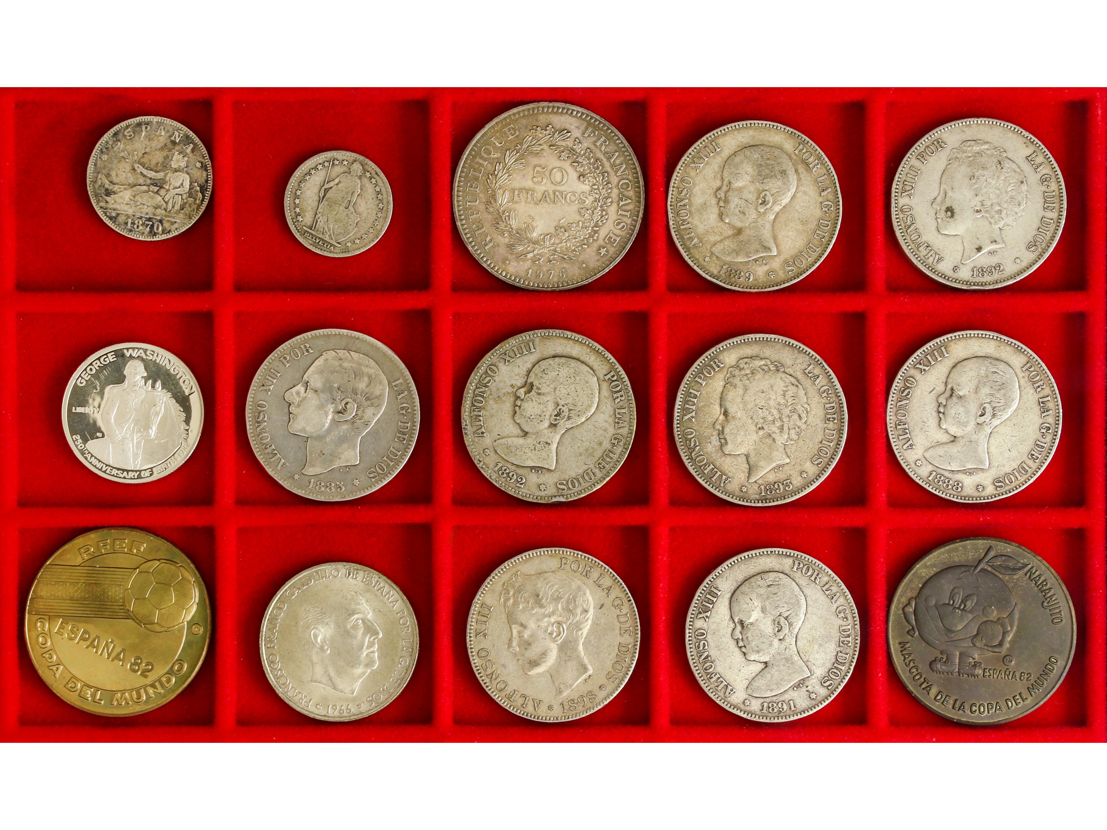 Lote 15 monedas 2 Pesetas, 5 Pesetas (8), 100 Pesetas, 1/2 Dollar, 1 Franco, 50 Francos, Medalla Conmemorativa (2). 1870 a 1982. AR. Medalla dedicada a los Mundiales de España´82. En estuche. Certificado medalla y 1/2