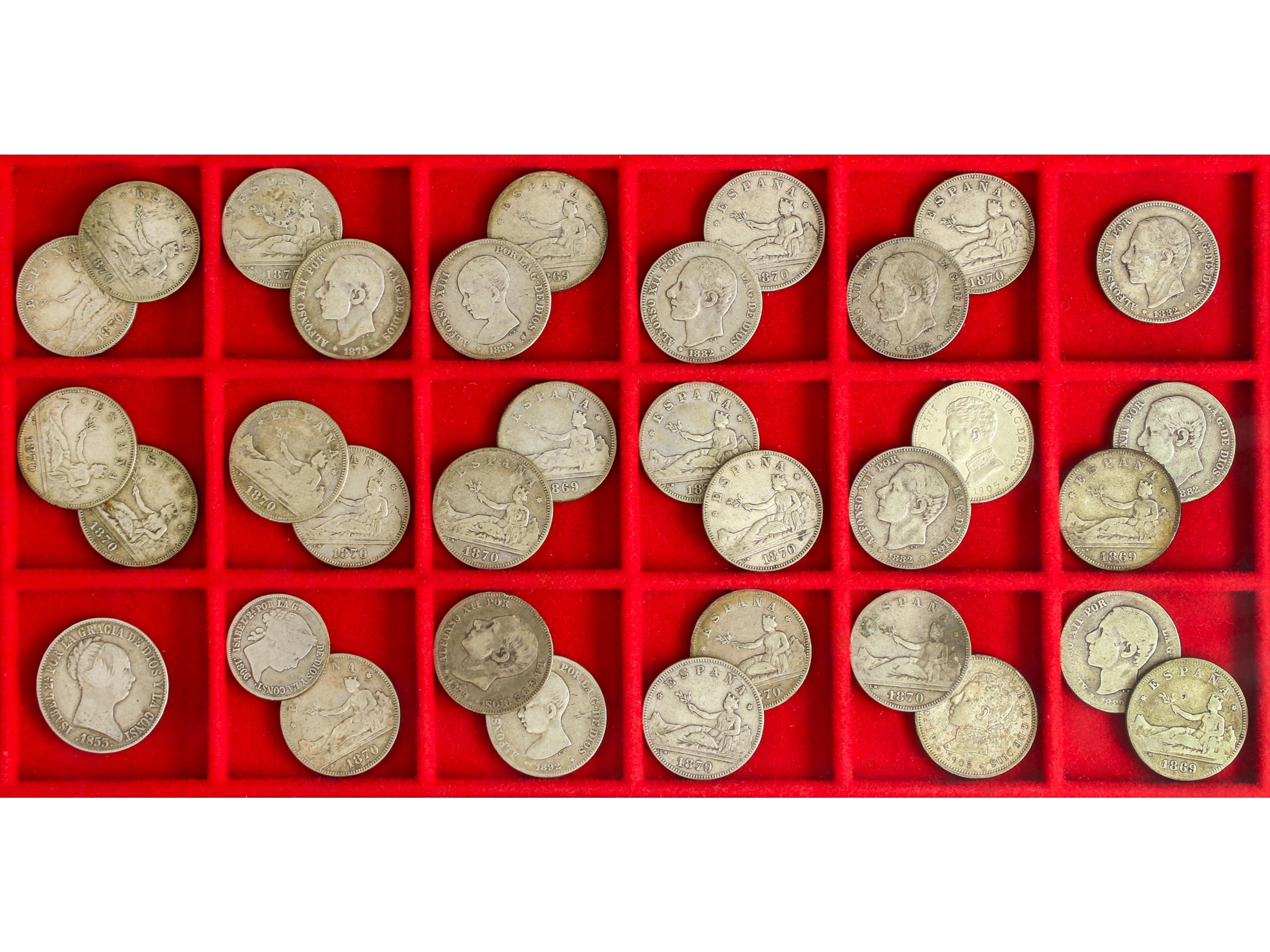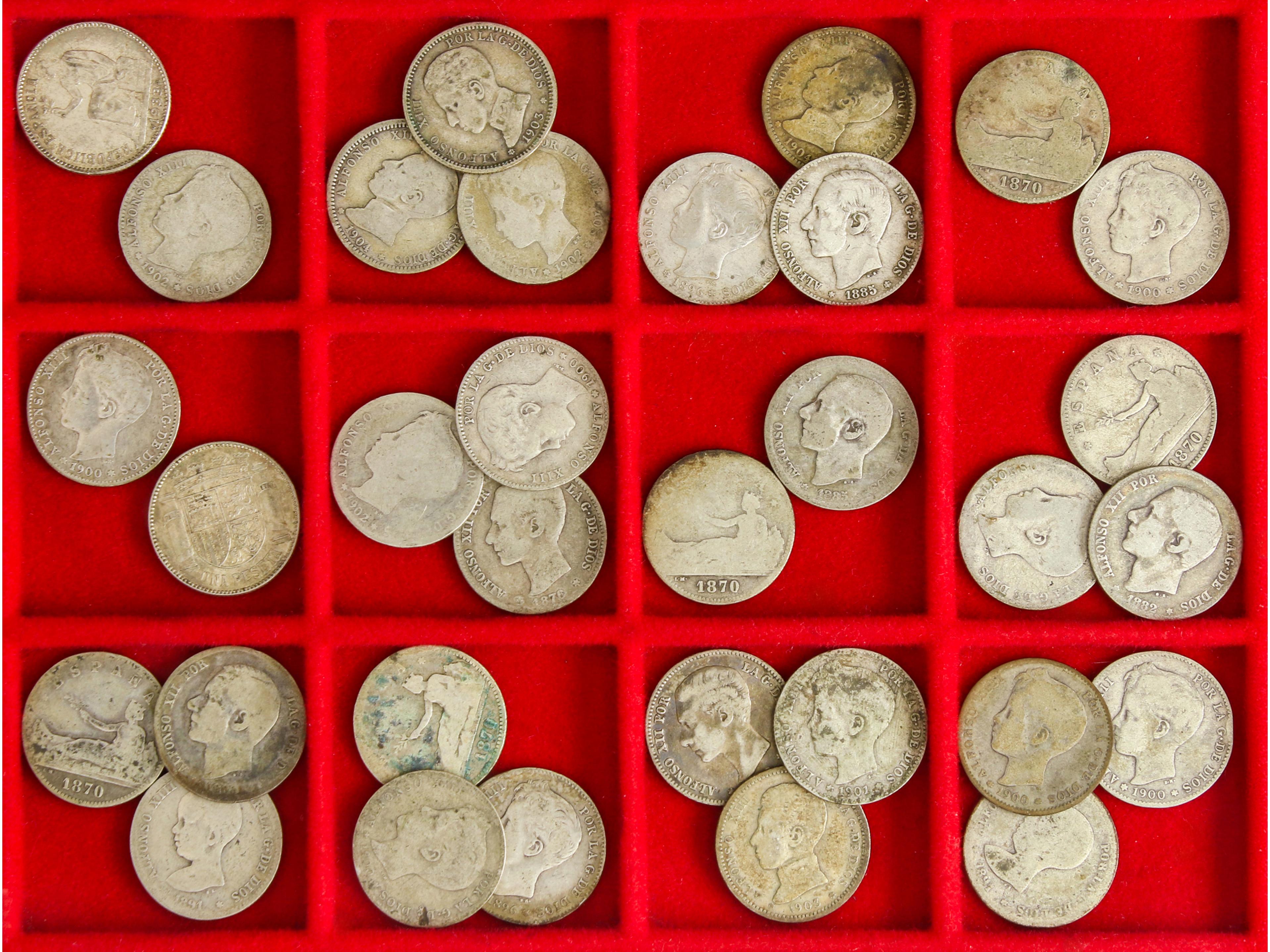 PROVISIONAL Y I REPÚBLICA: 2 Pesetas 1869 y 1870 (20); ALFONSO XII: 2 Pesetas 1879 y 1882 (8); ALFONSO XIII: 2 Pesetas 1892 a 1905 (4). (A EXAMINAR). BC+ a MBC+.