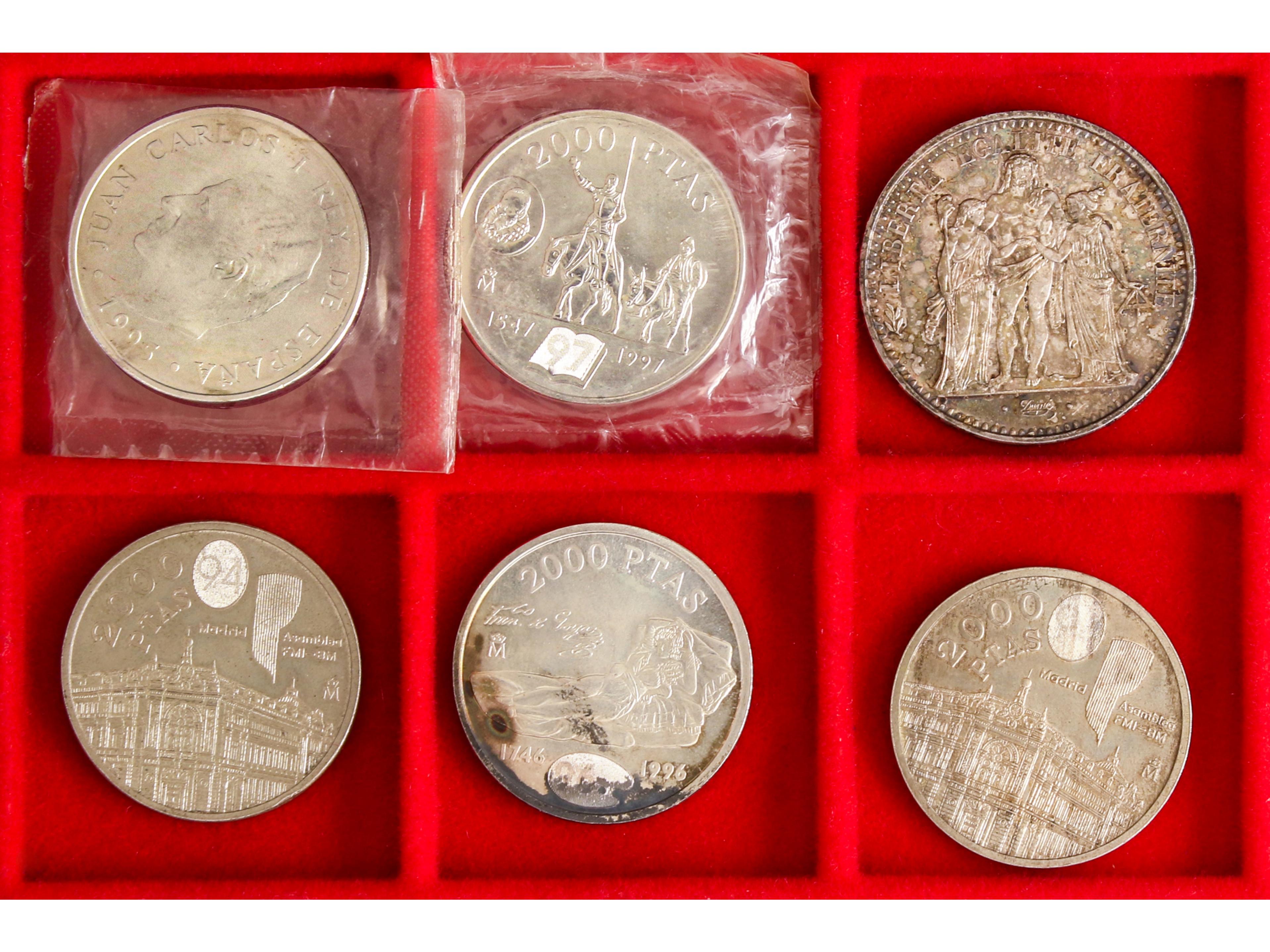 Lote 6 monedas 2.000 Pesetas (5) y 10 Francos. 1965 a 1997. 115,00 grs. AR. ESPAÑA: Juan Carlos I. Emisiones nuevo diseño; FRANCIA: 10 Francos, Hércules. (A EXAMINAR). HG-557(2)/560; KM-932. EBC a SC. (Image1)