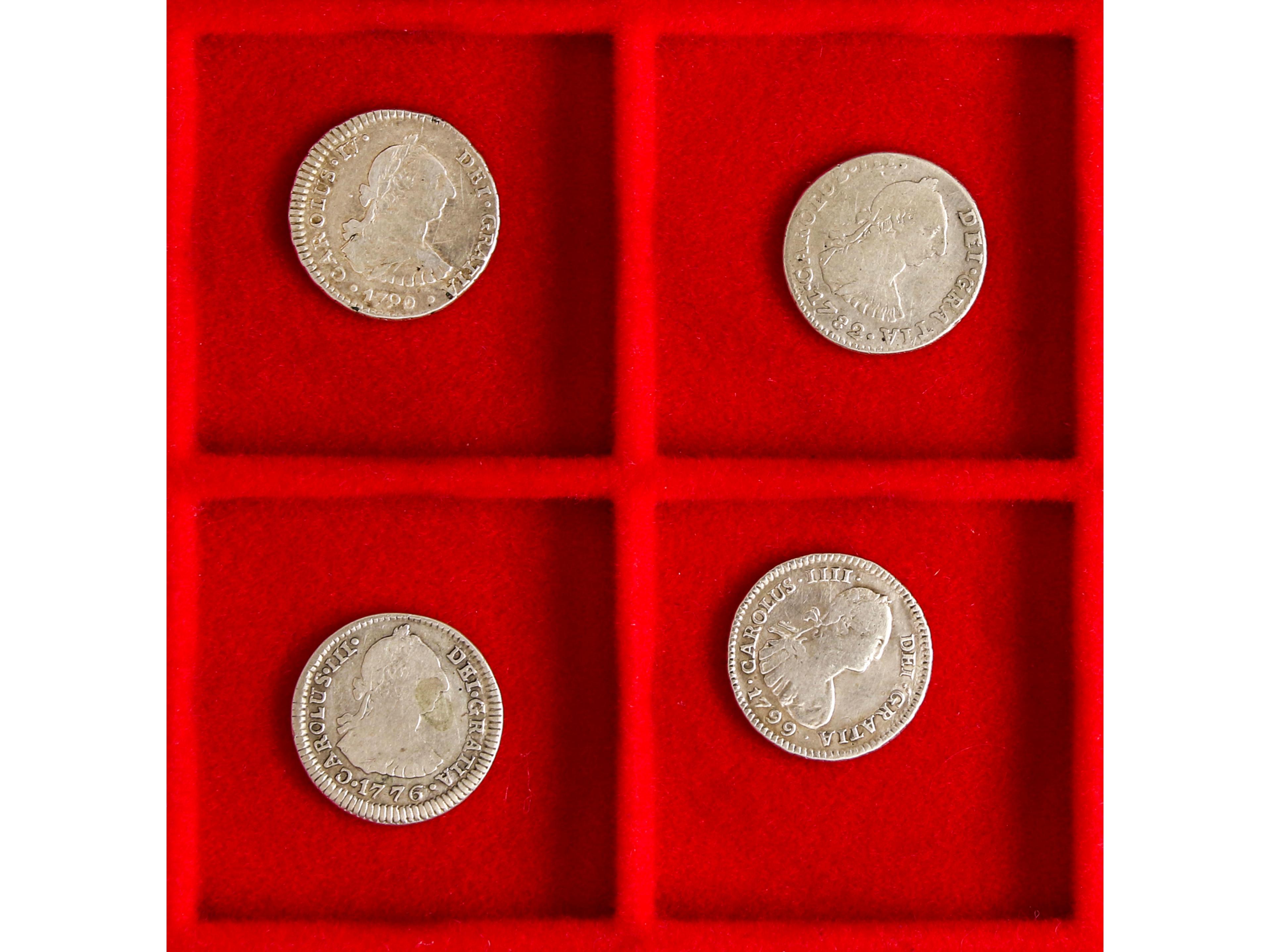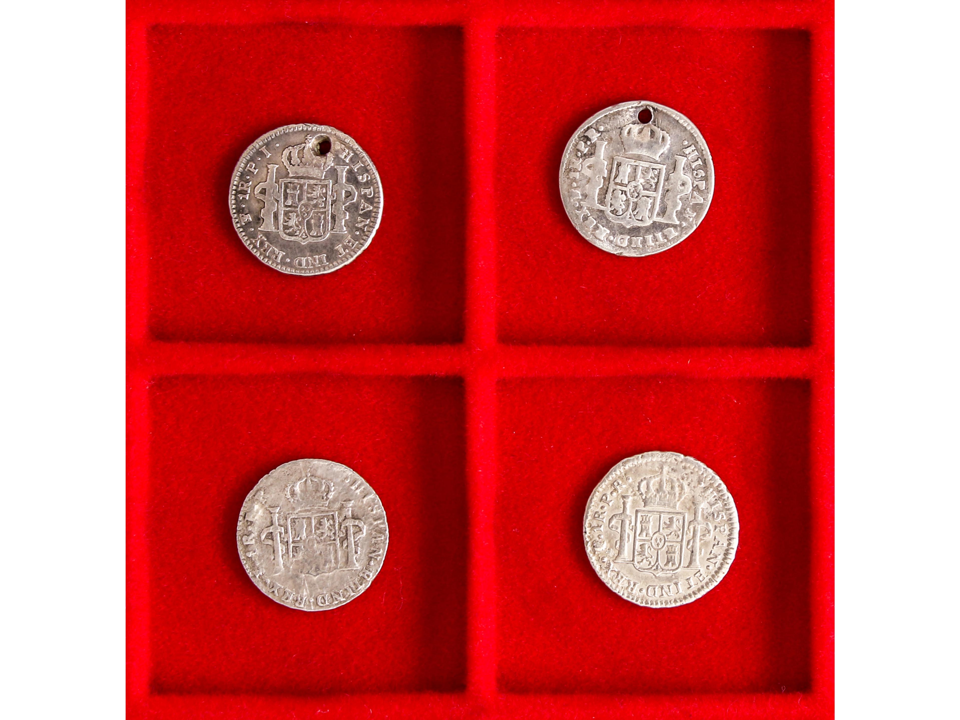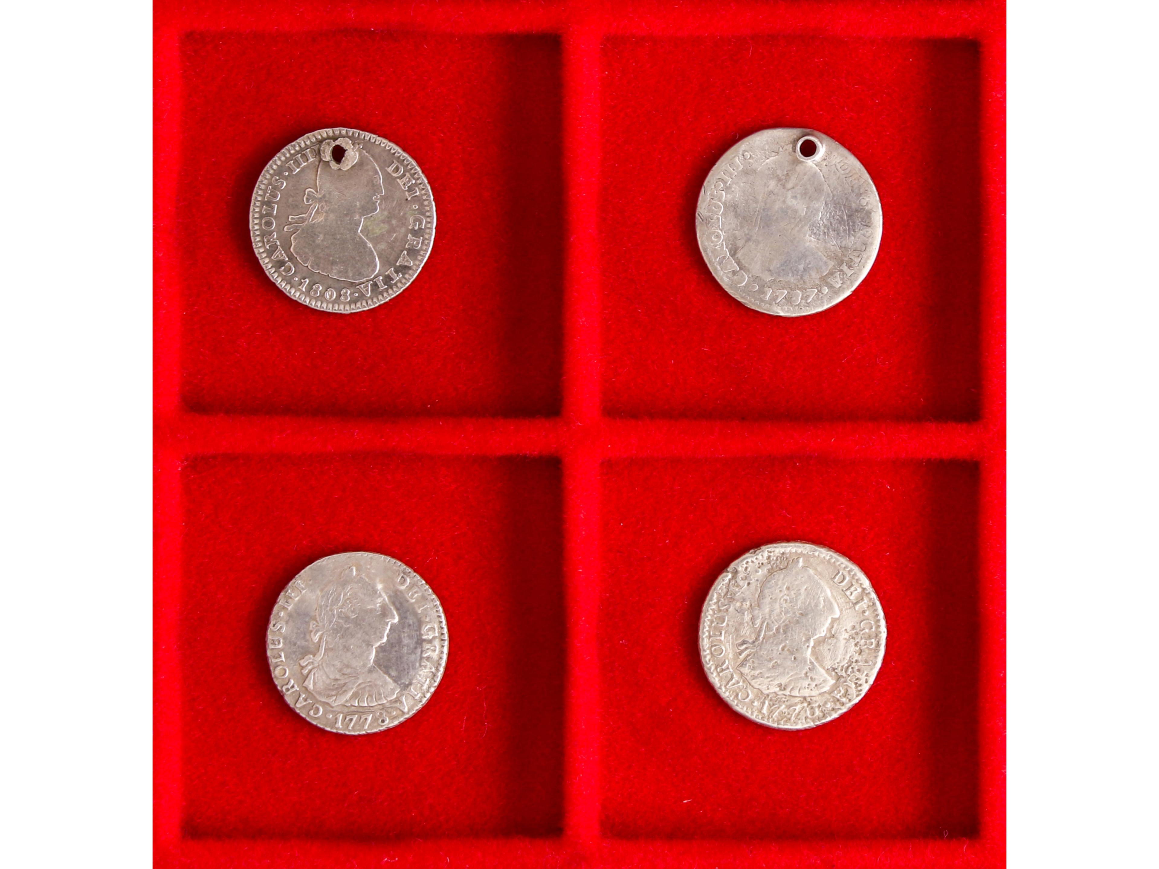 Lote 4 monedas 1 Real. 1776, 78, 87, 1808. CARLOS III y IV. POTOSÍ. (Perforaciones). Carlos III: AC-475, 481, 496. Carlos IV: AC-484. RC a BC+. (Image1) (Image2)