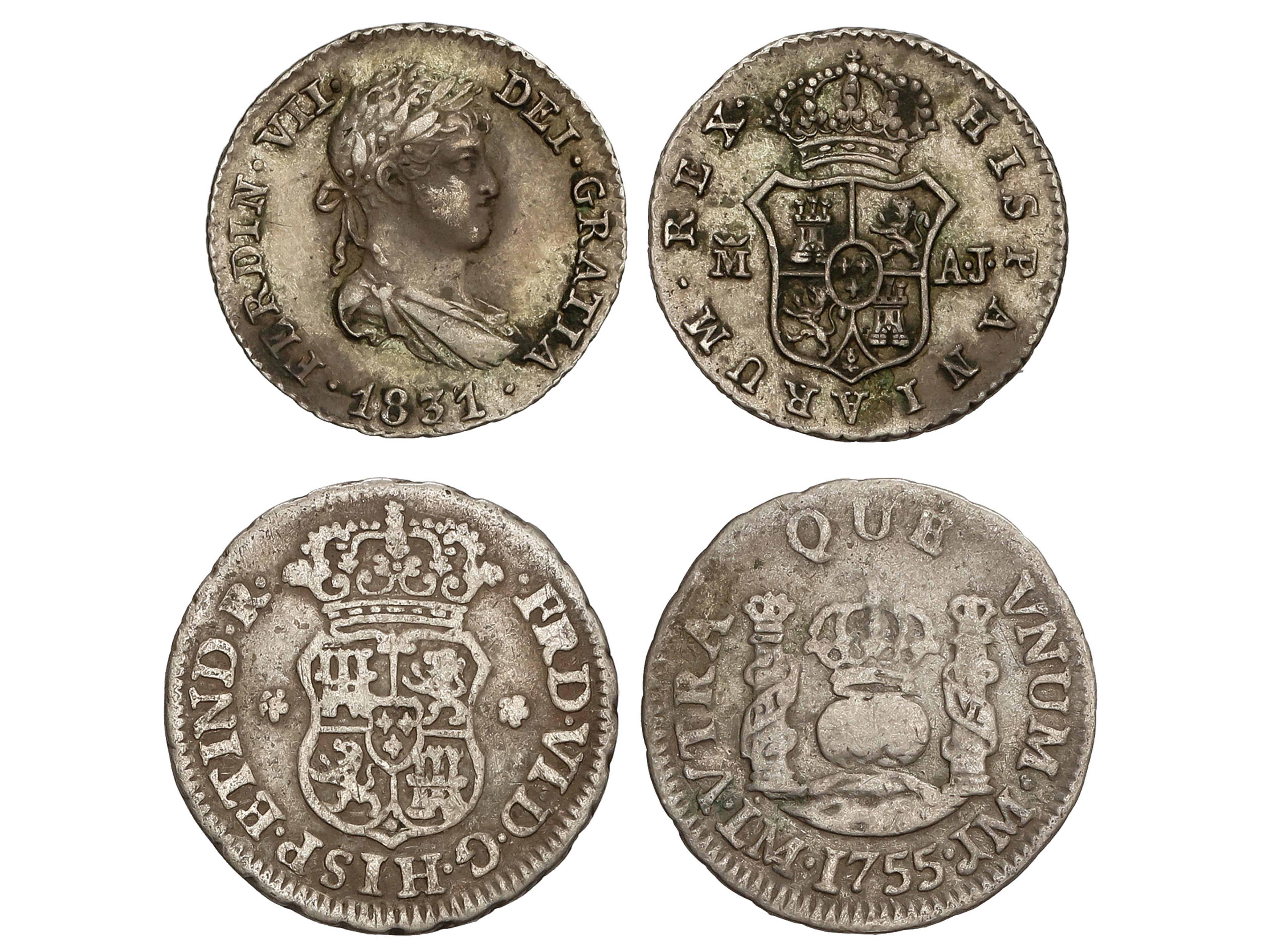 Lote 2 monedas 1/2 Real. 1755 y 1831. FERNANDO VI y VII. LIMA J.M. y MADRID A.J. A EXAMINAR. Fernando VI: AC-157. Fernando VII: AC-594. MBC- a MBC. (Image1)