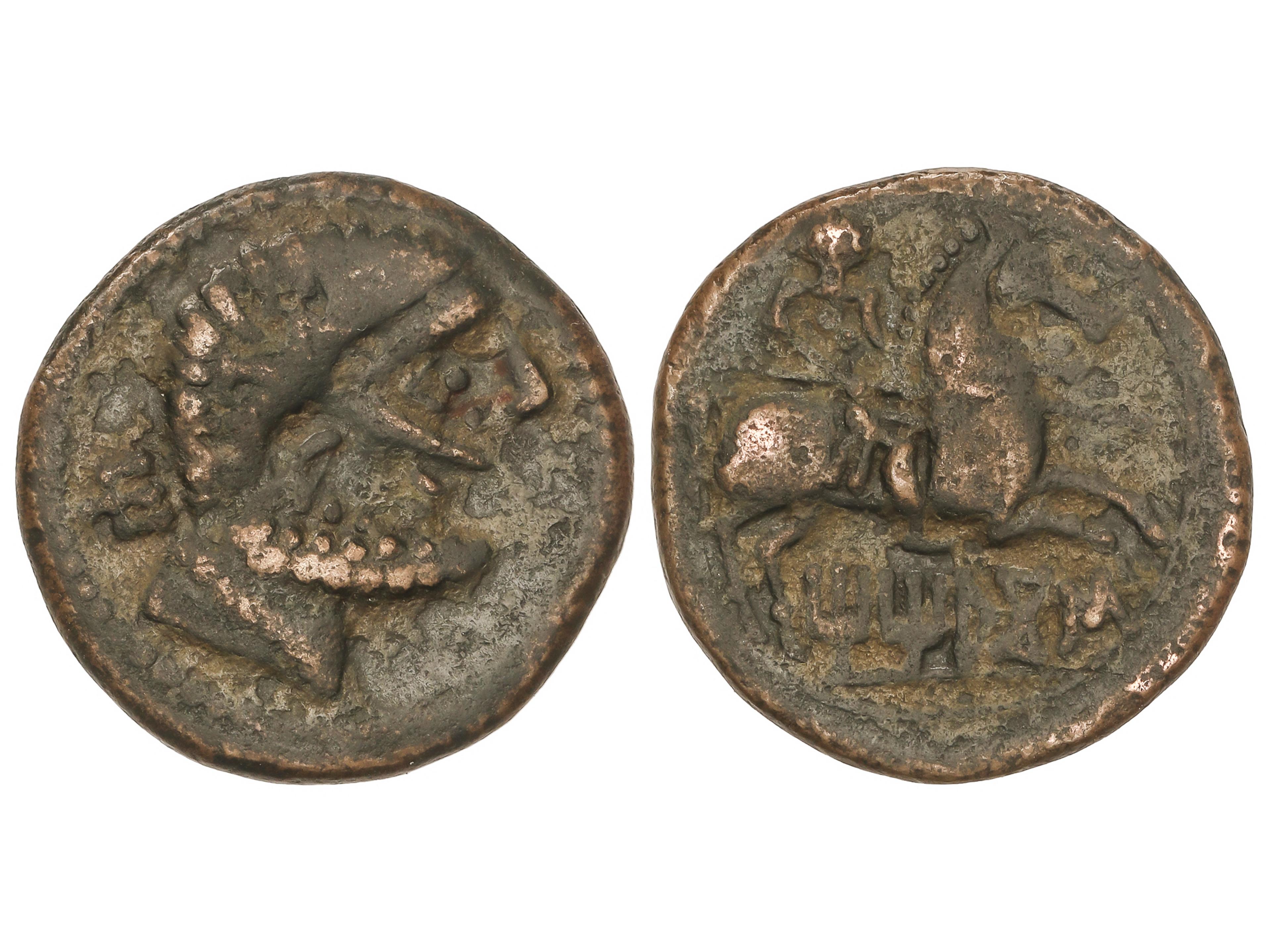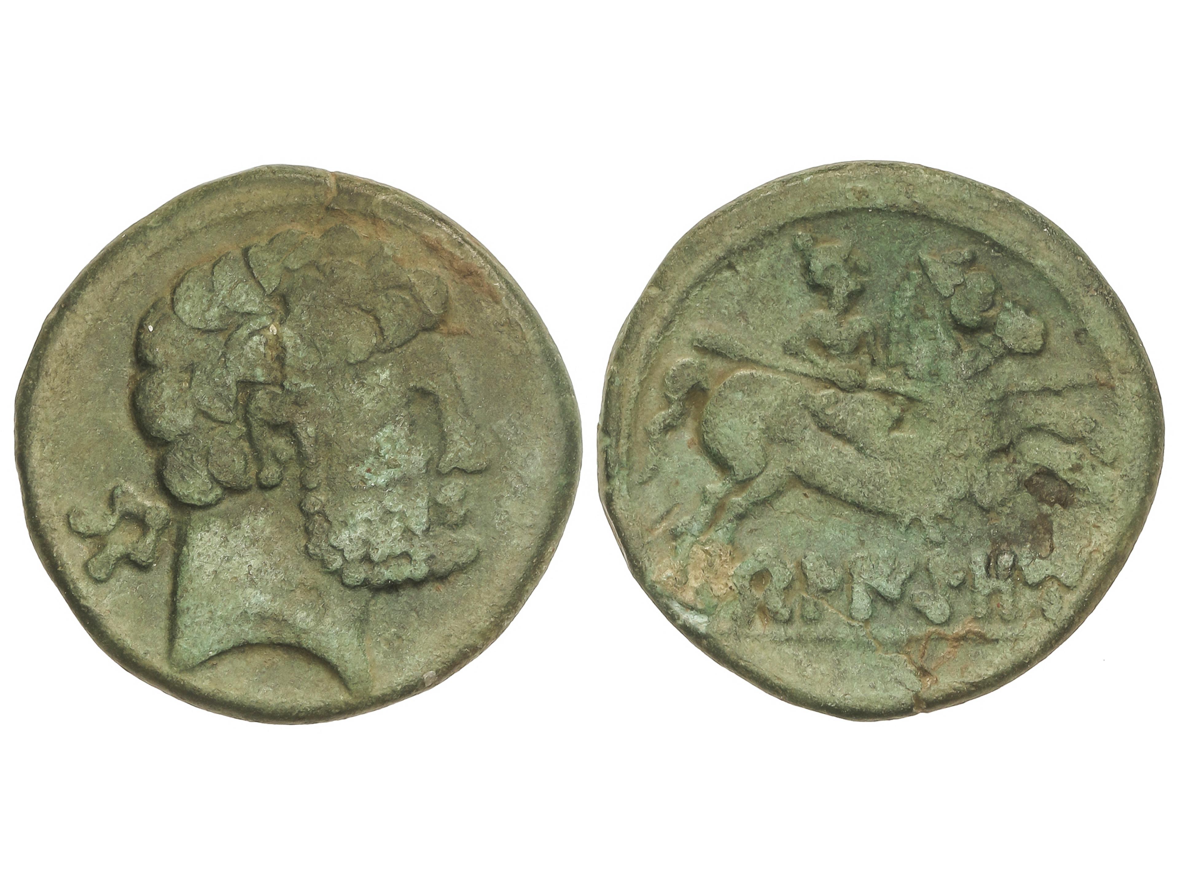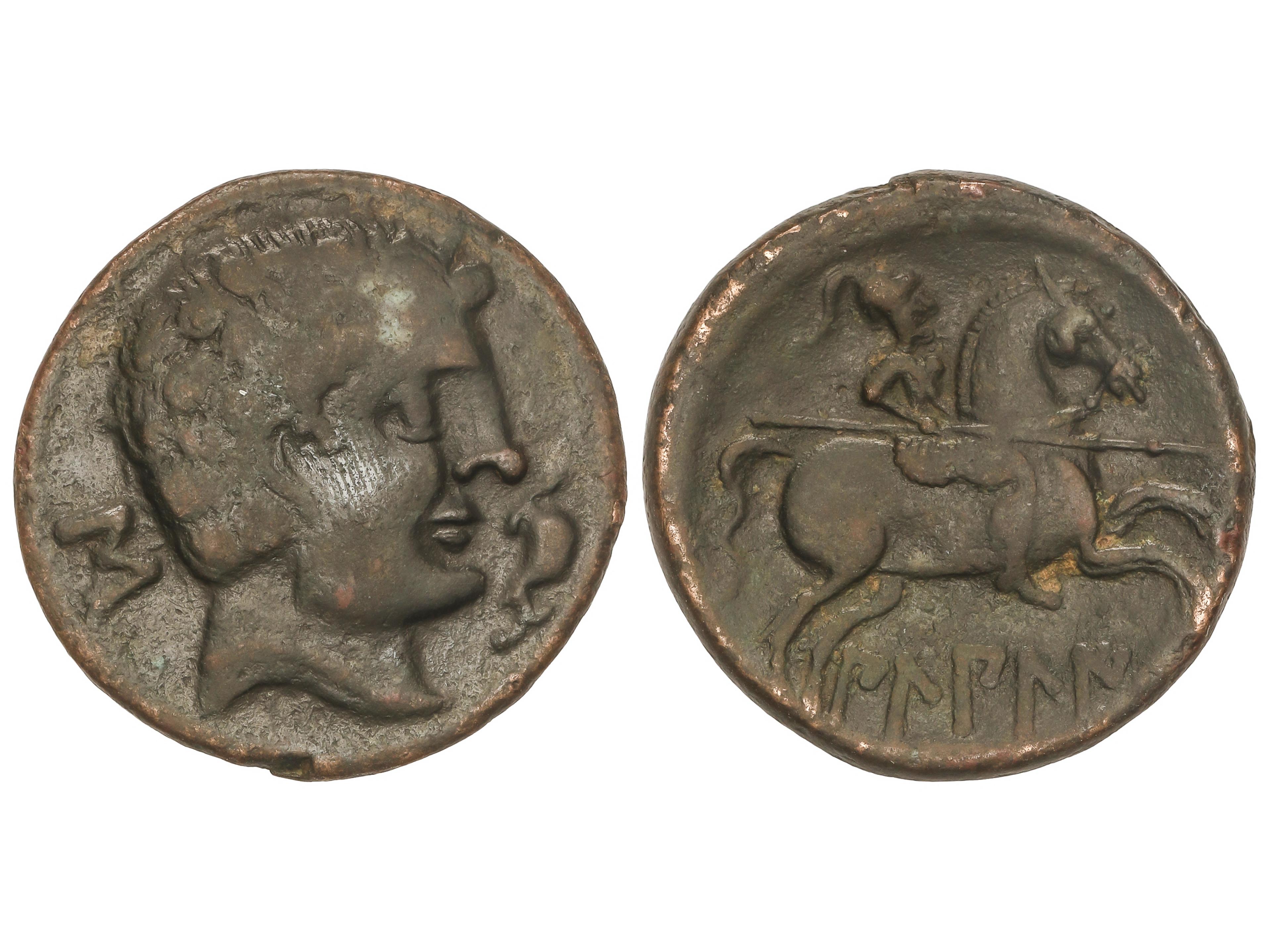 As. 120-80 a.C. CONTERBIA CARBICA (VILLAS VIEJAS, Cuenca). Anv.: Cabeza masculina sin barba a derecha, delante delfín, detrás letra ibéricas. Rev.: Jinete con lanza a derecha, debajo leyenda ibérica bajo línea. 12,18