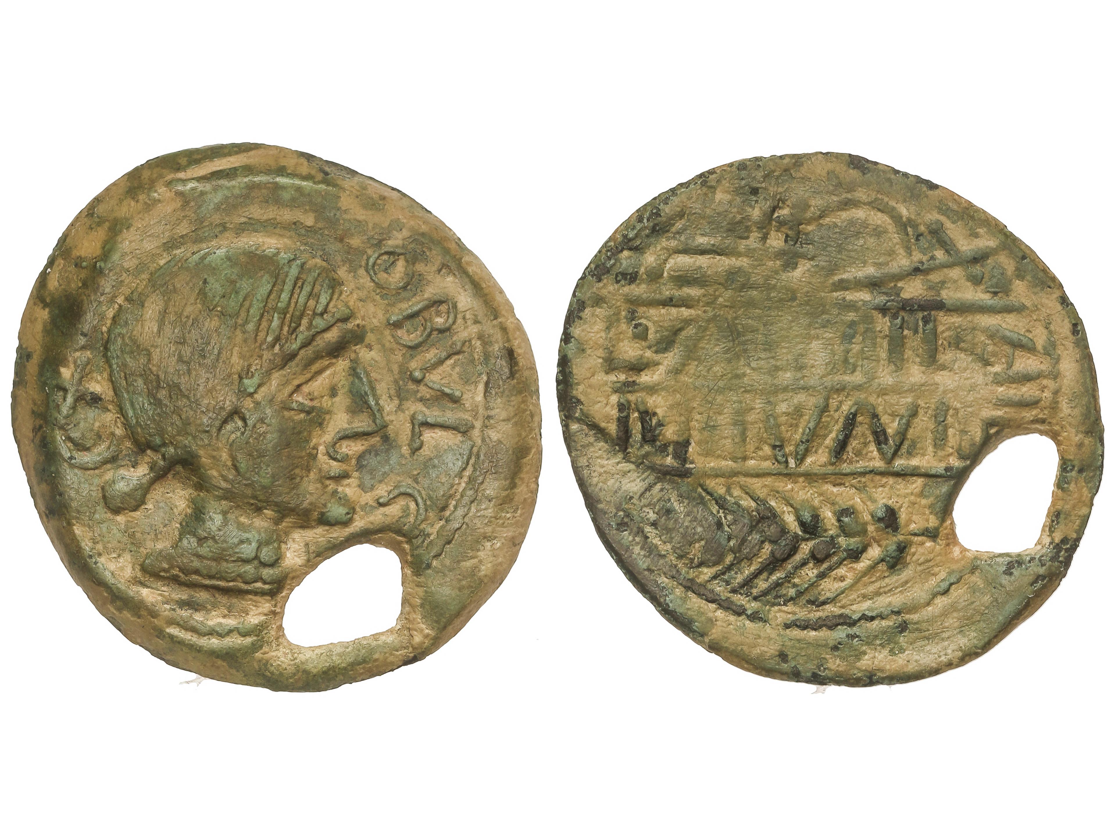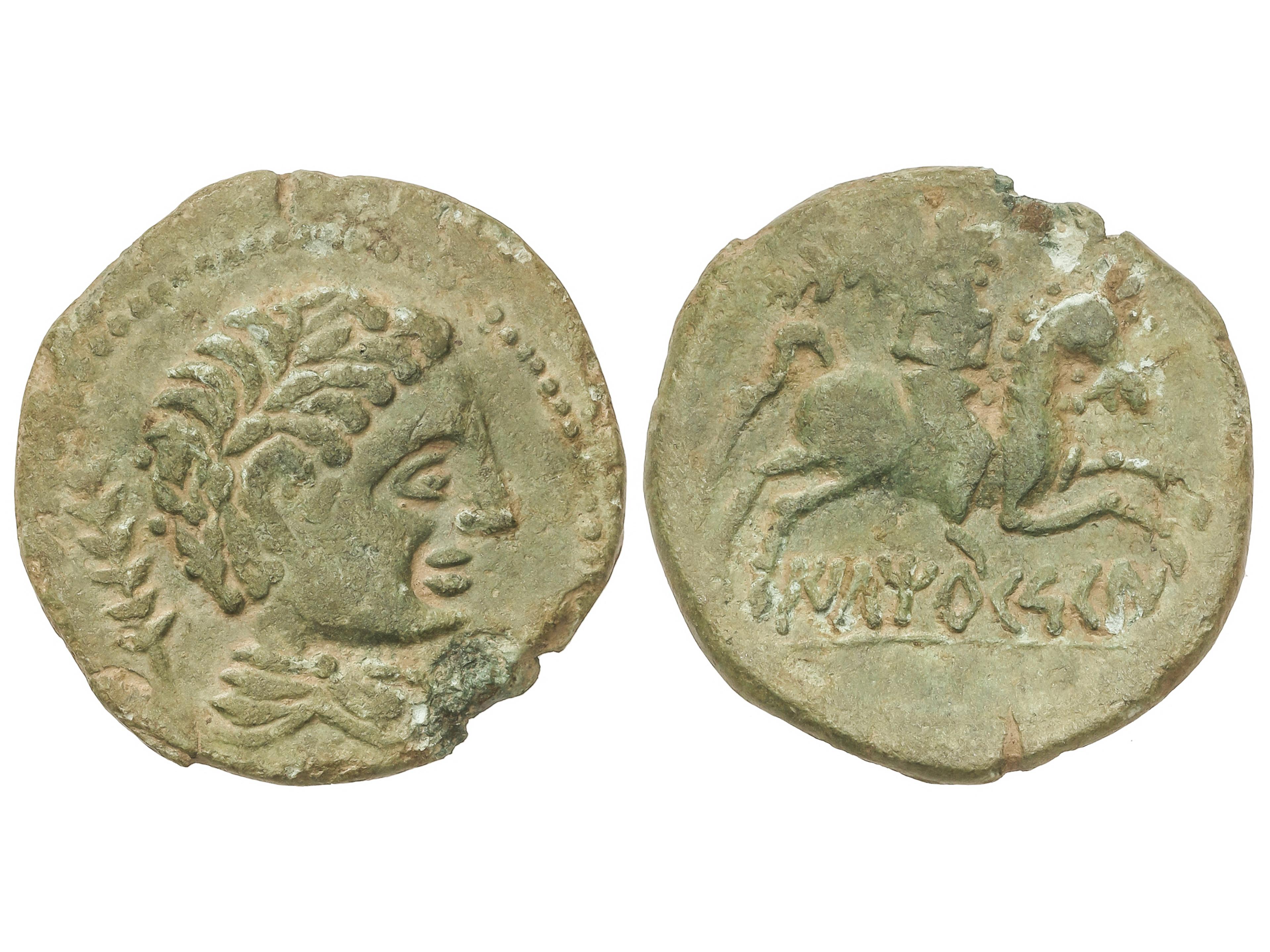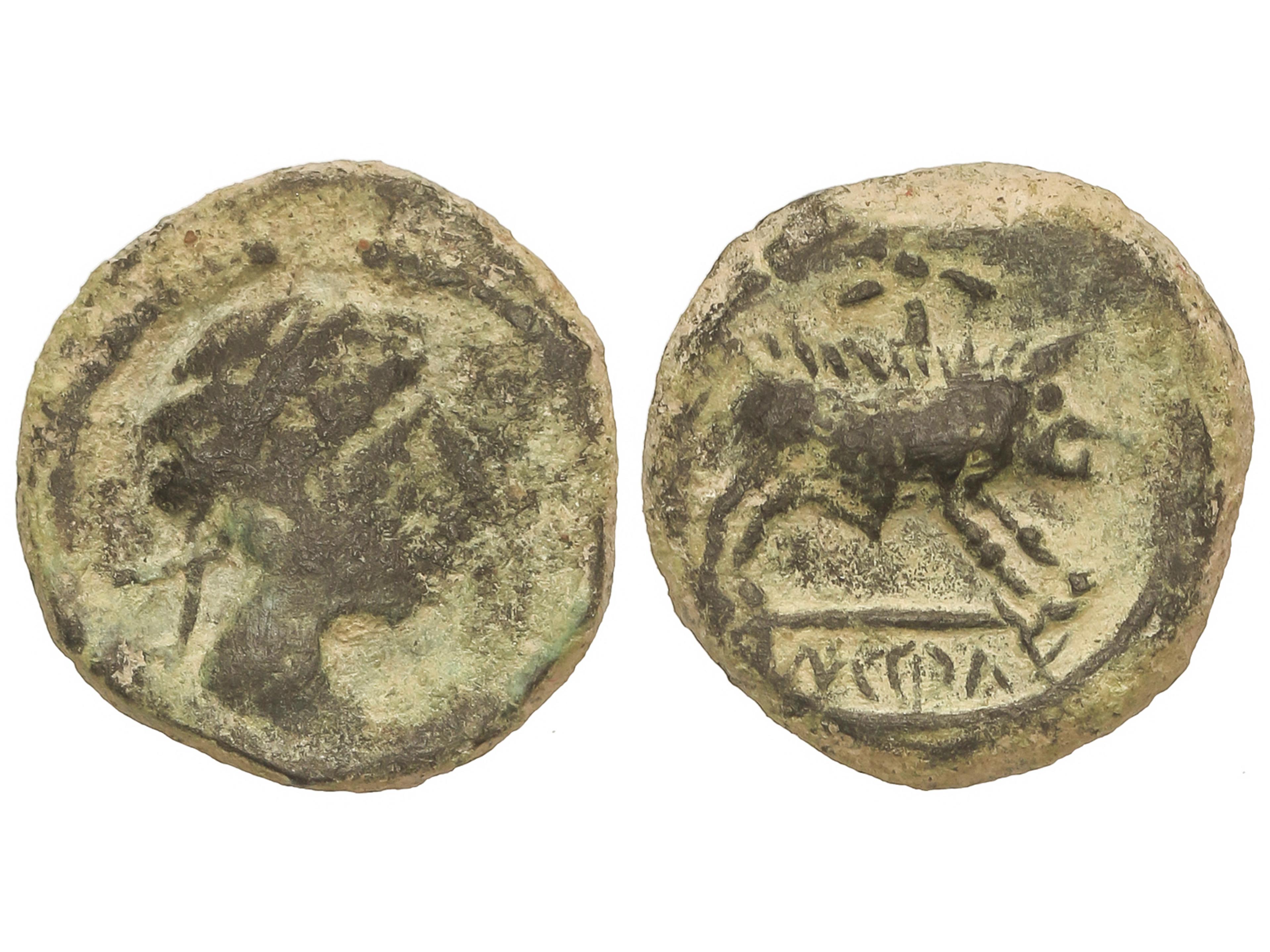 As. 120-80 a.C. CONTERBIA CARBICA (VILLAS VIEJAS, Cuenca). Anv.: Cabeza masculina sin barba a derecha, delante delfín, detrás letra ibéricas. Rev.: Jinete con lanza a derecha, debajo leyenda ibérica bajo línea. 12,18