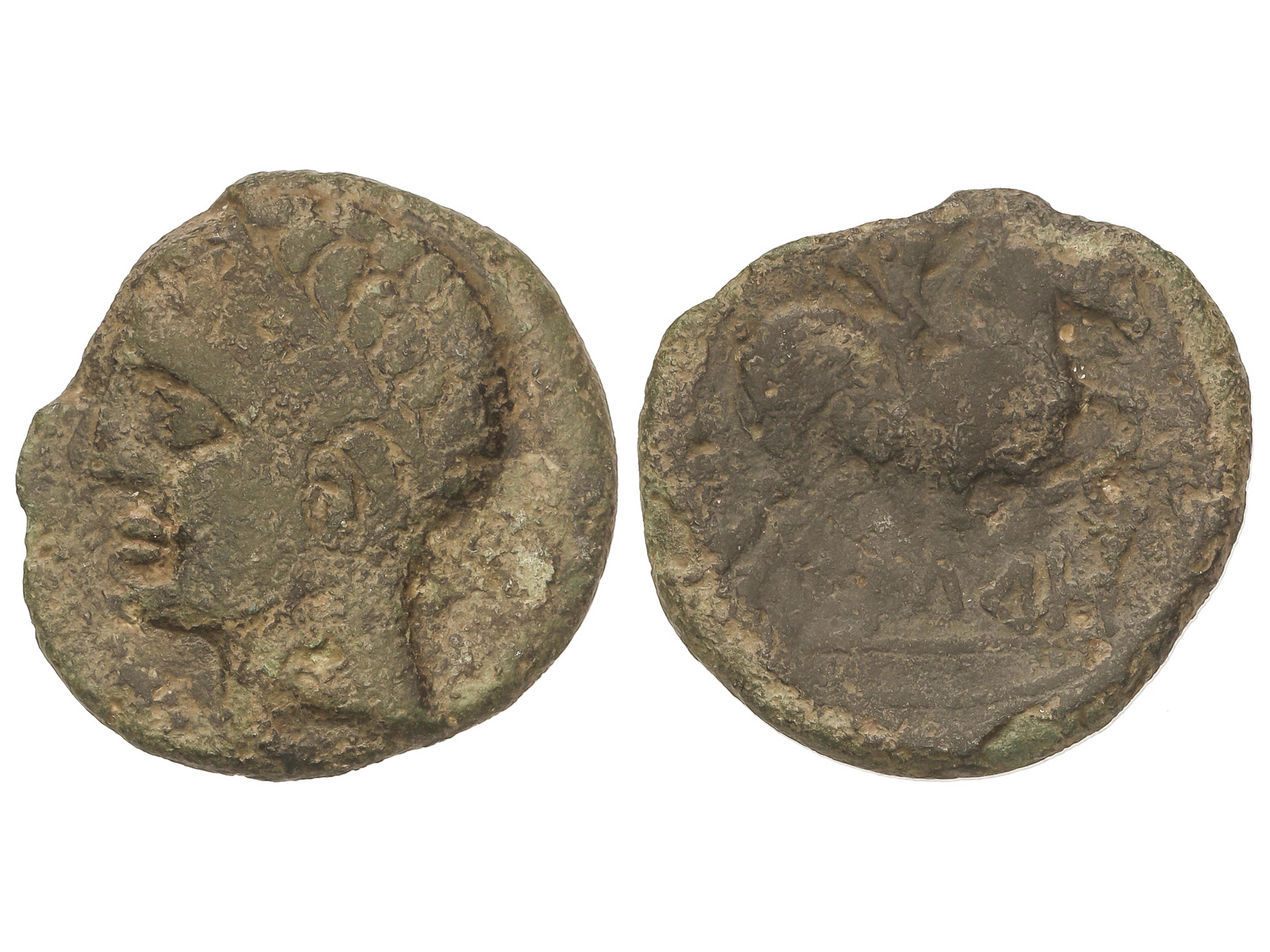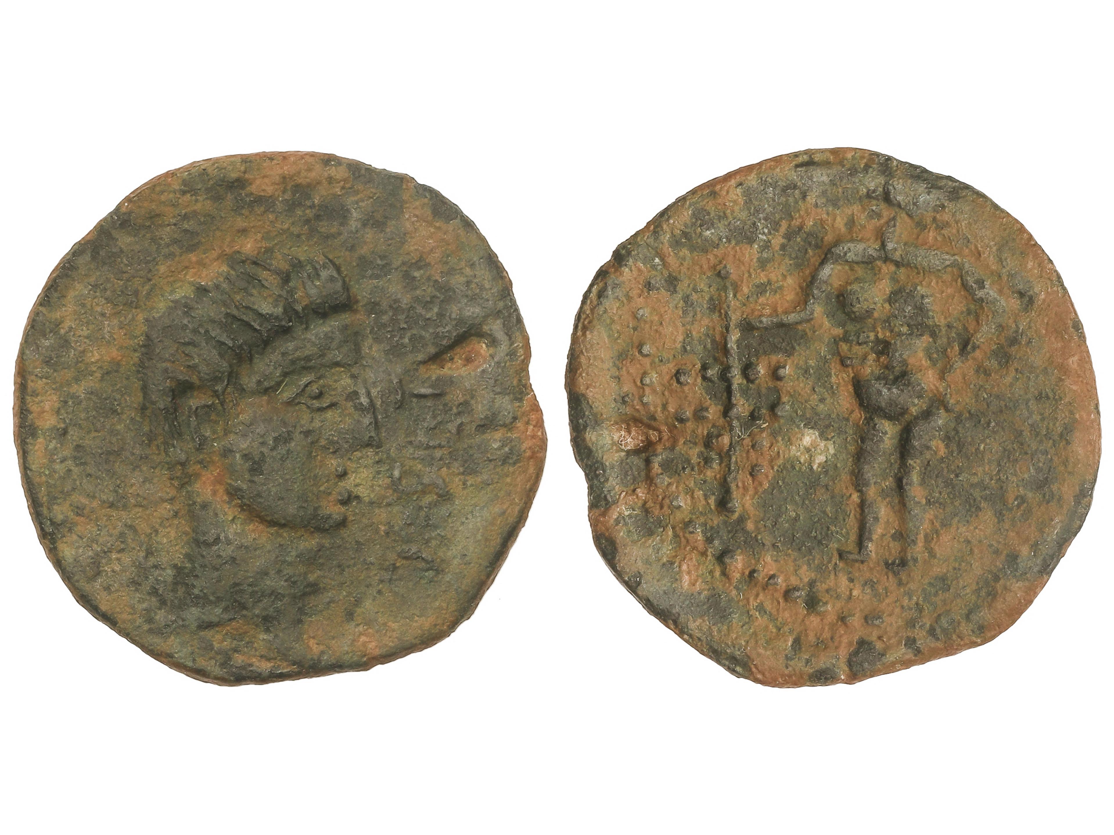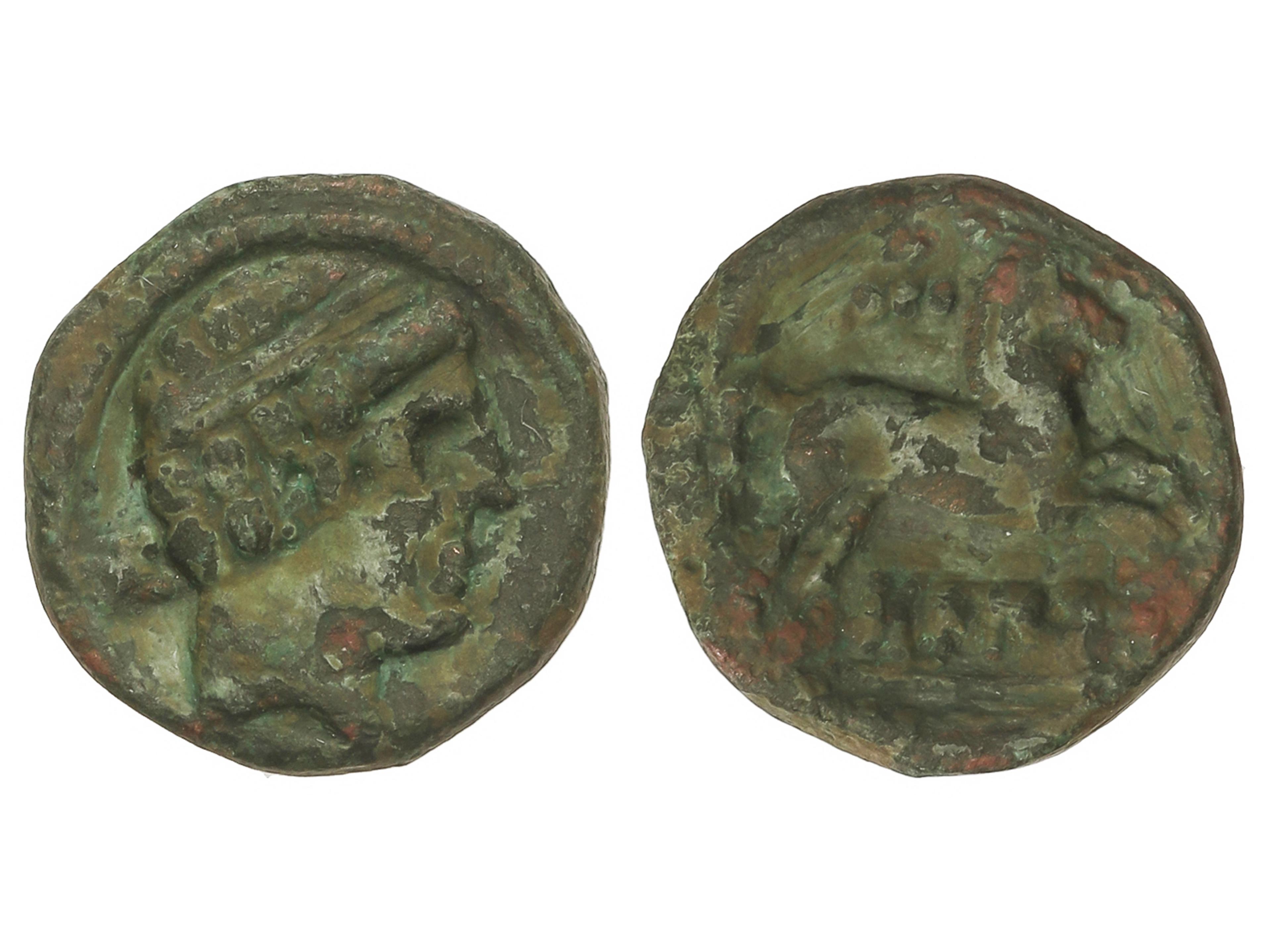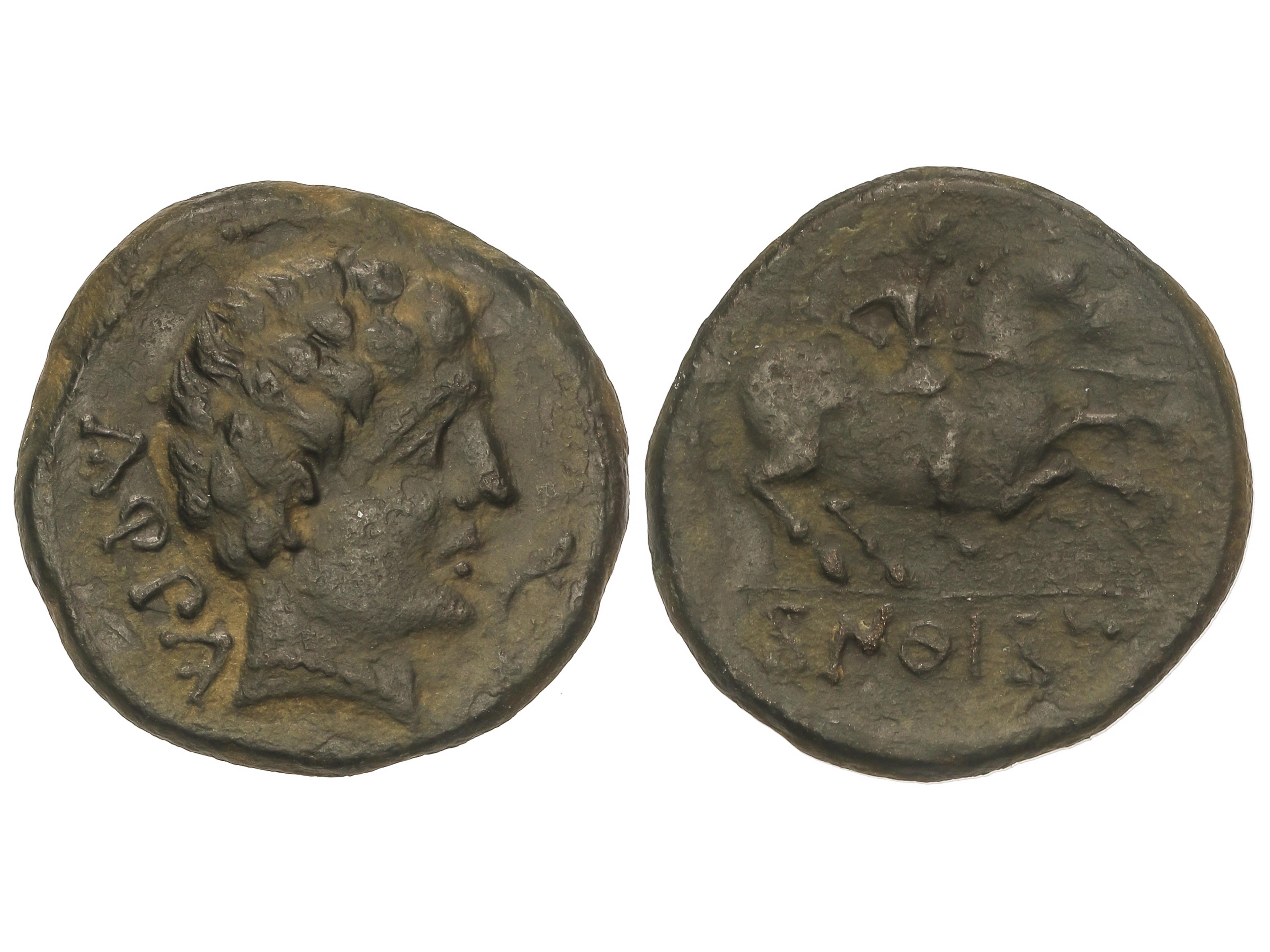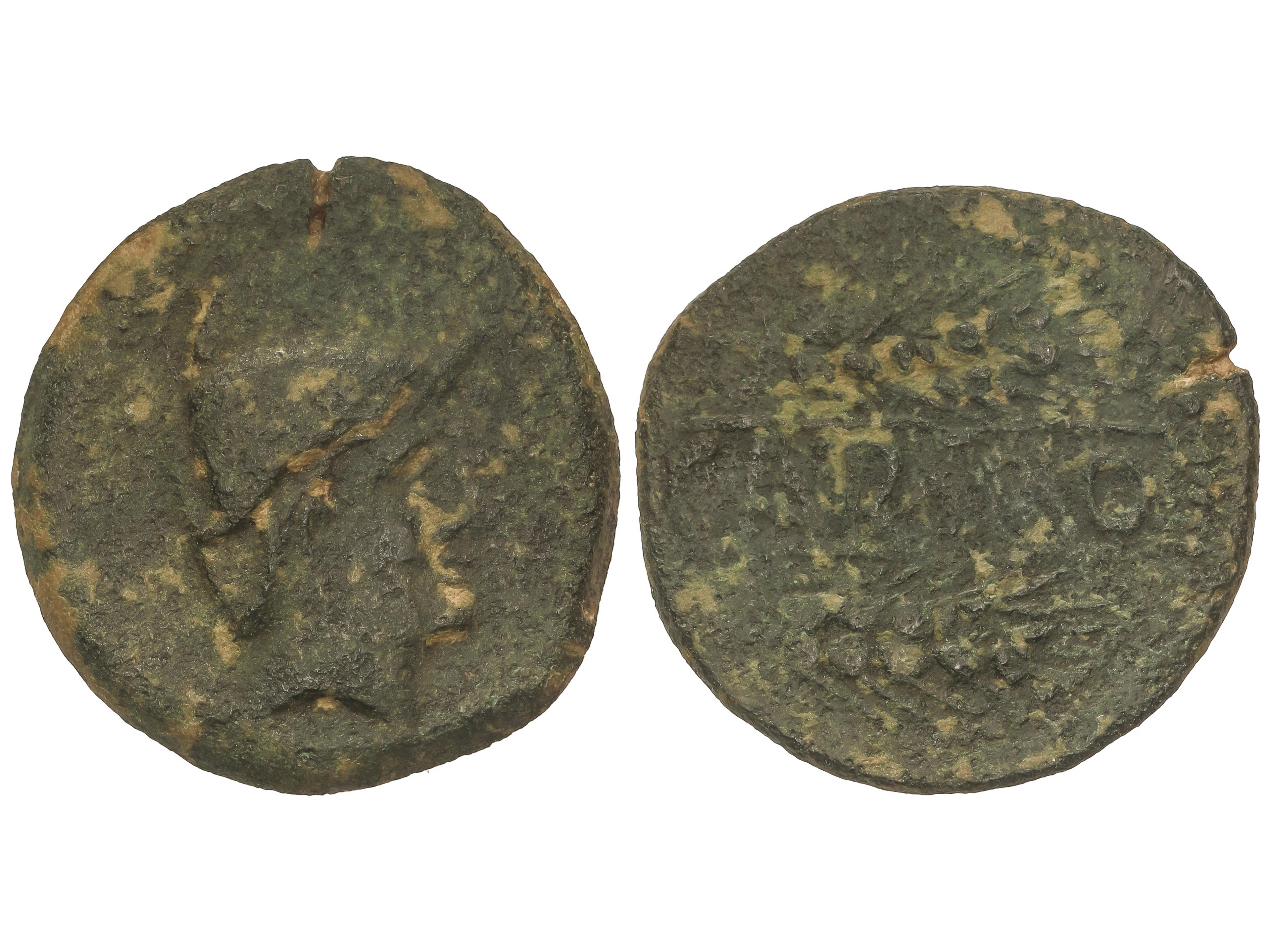 As. 120-20 a.C. BELIGIOM (BELCHITE, Zaragoza). Anv.: Cabeza barbada a derecha, detrás letra ibérica Be. Rev.: Jinete con lanza a derecha, debajo leyenda ibérica. 7,08 grs. AE. Pátina verde. AB-243; ACIP-1433.