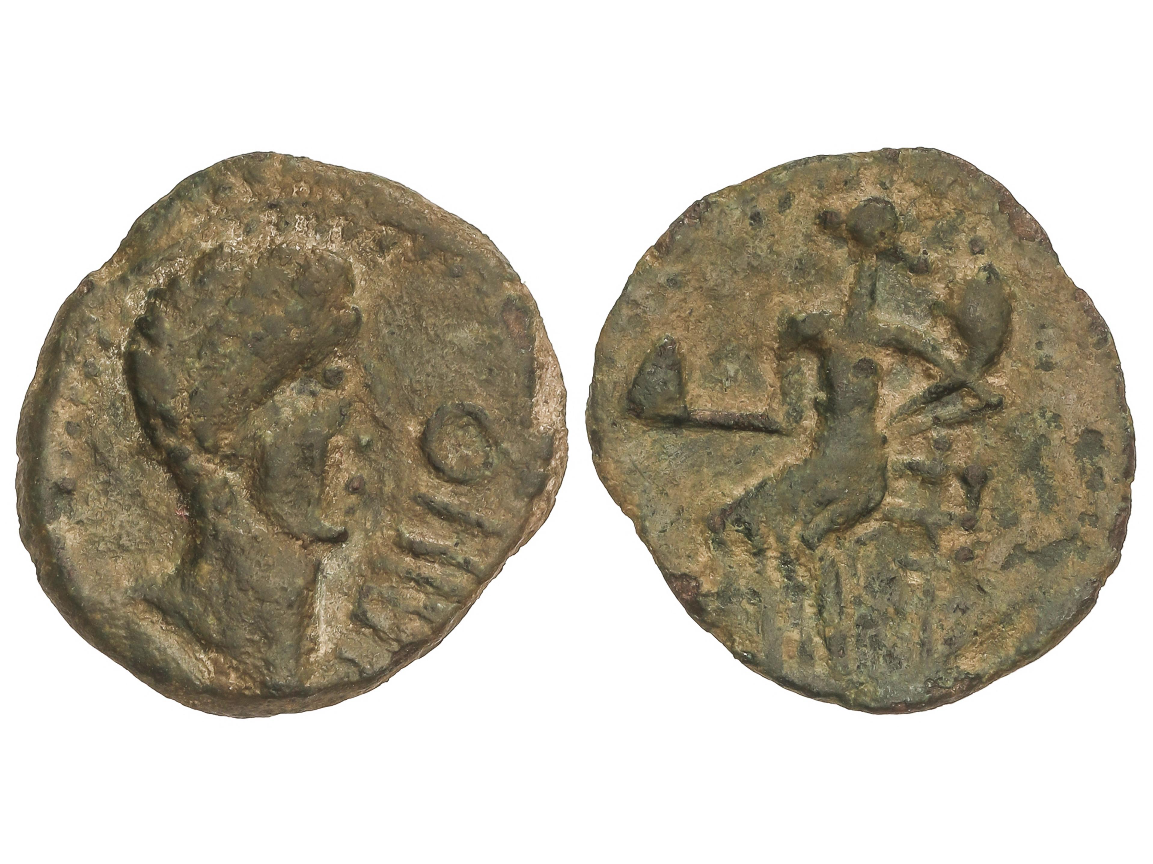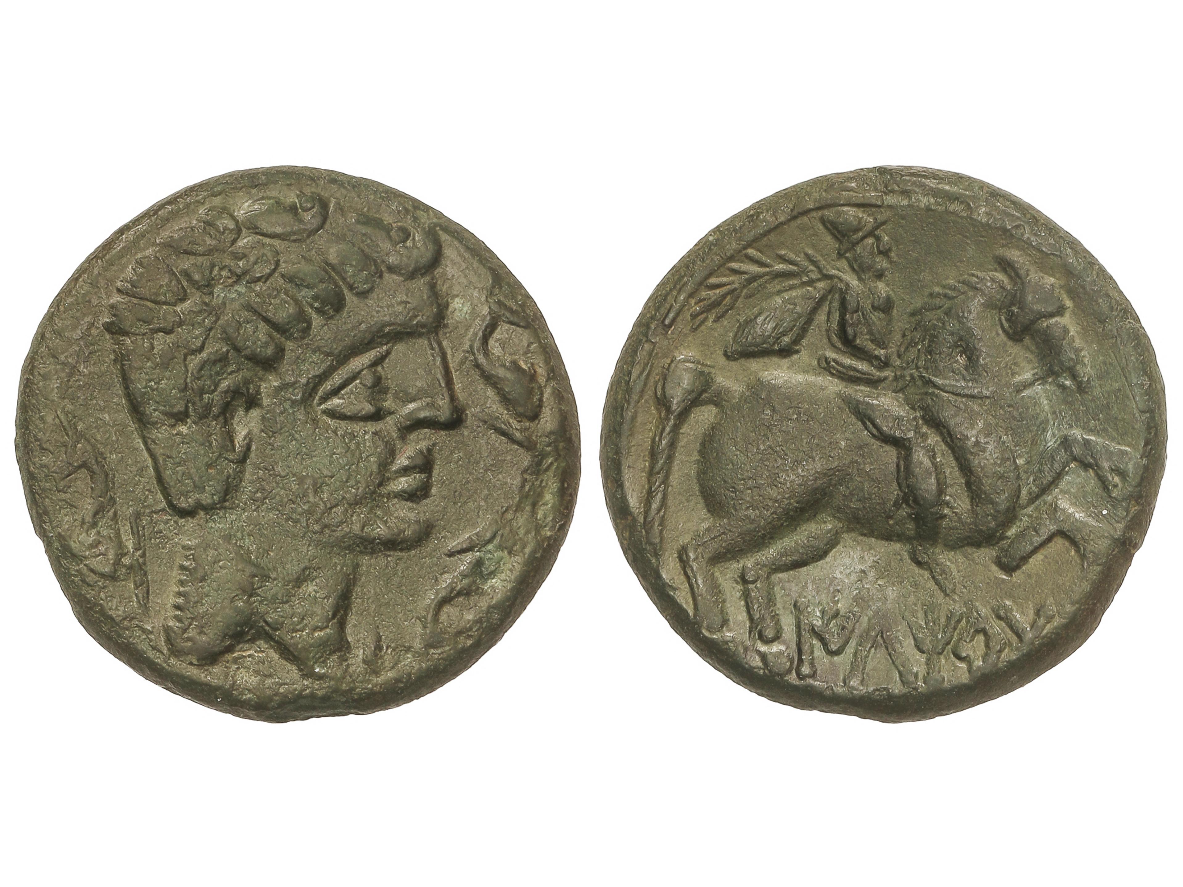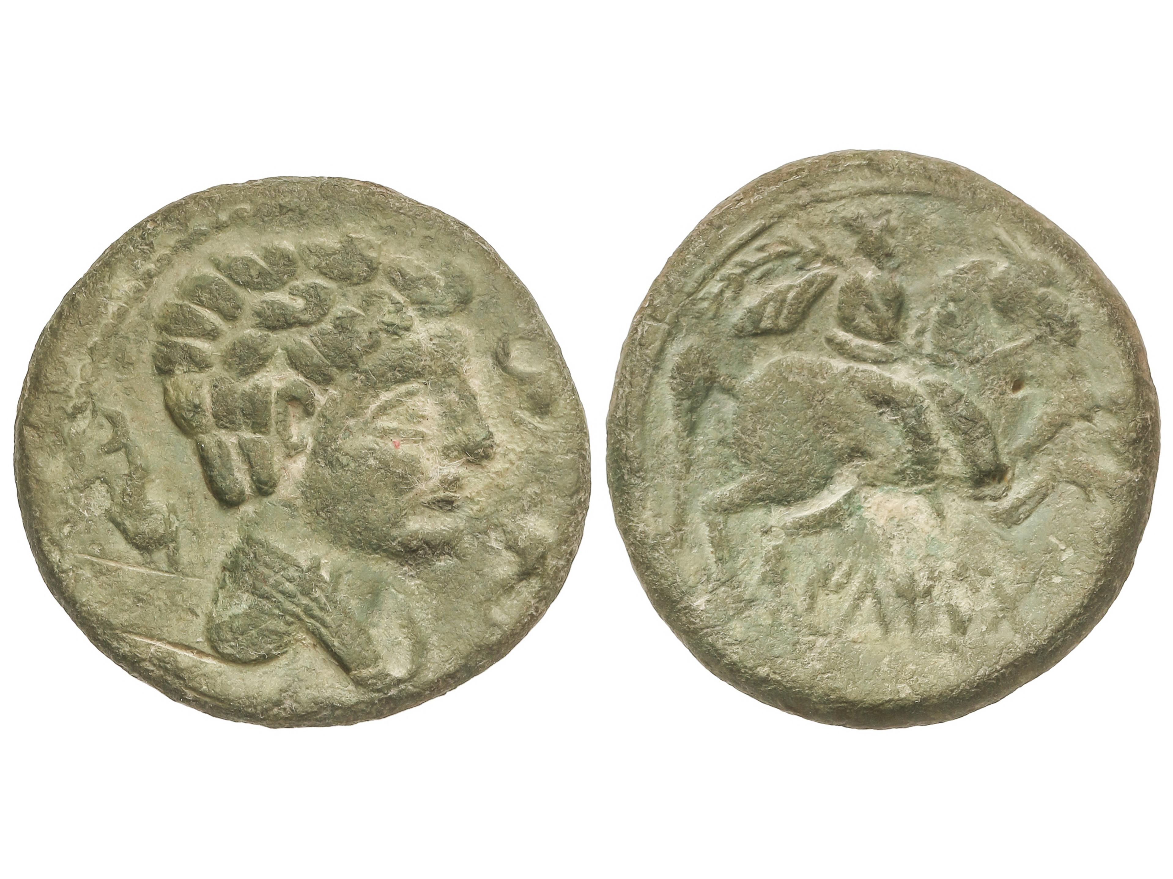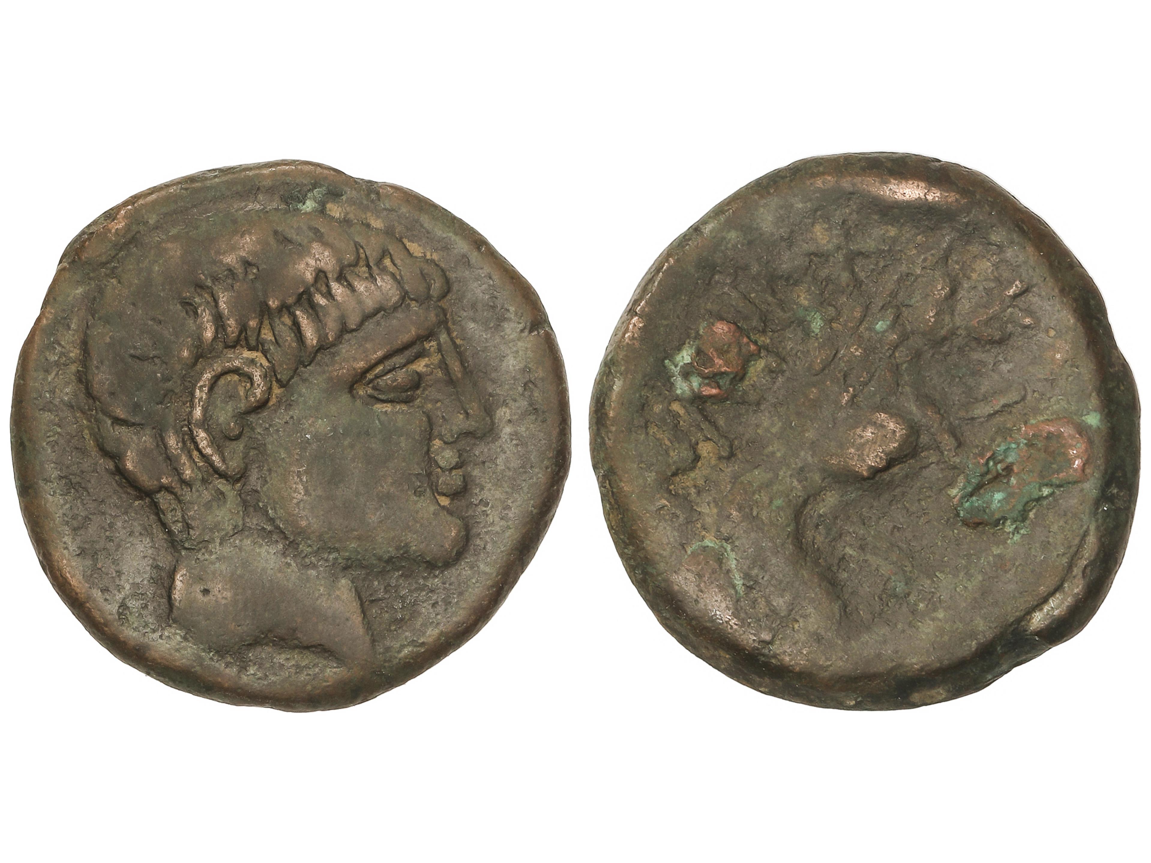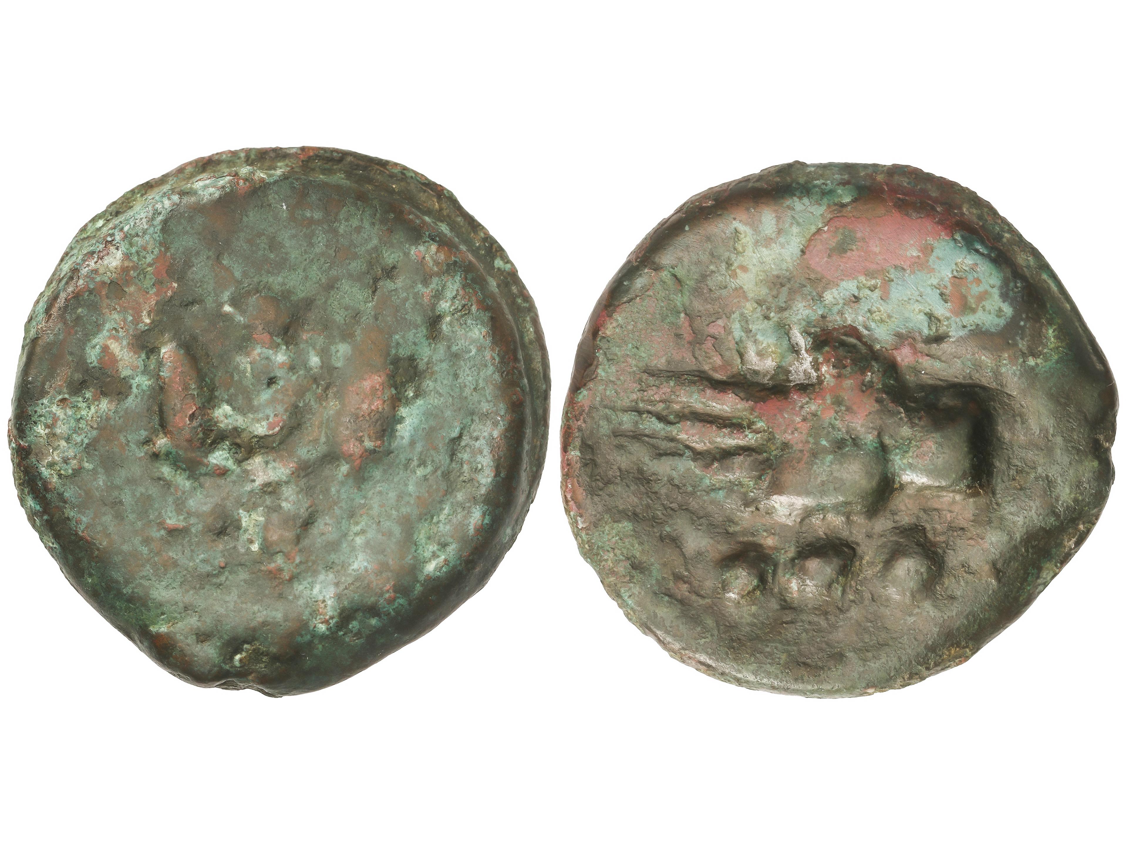 As. 120-20 a.C. BELIGIOM (BELCHITE, Zaragoza). Anv.: Cabeza barbada a derecha, detrás letra ibérica Be. Rev.: Jinete con lanza a derecha, debajo leyenda ibérica. 7,08 grs. AE. Pátina verde. AB-243; ACIP-1433.