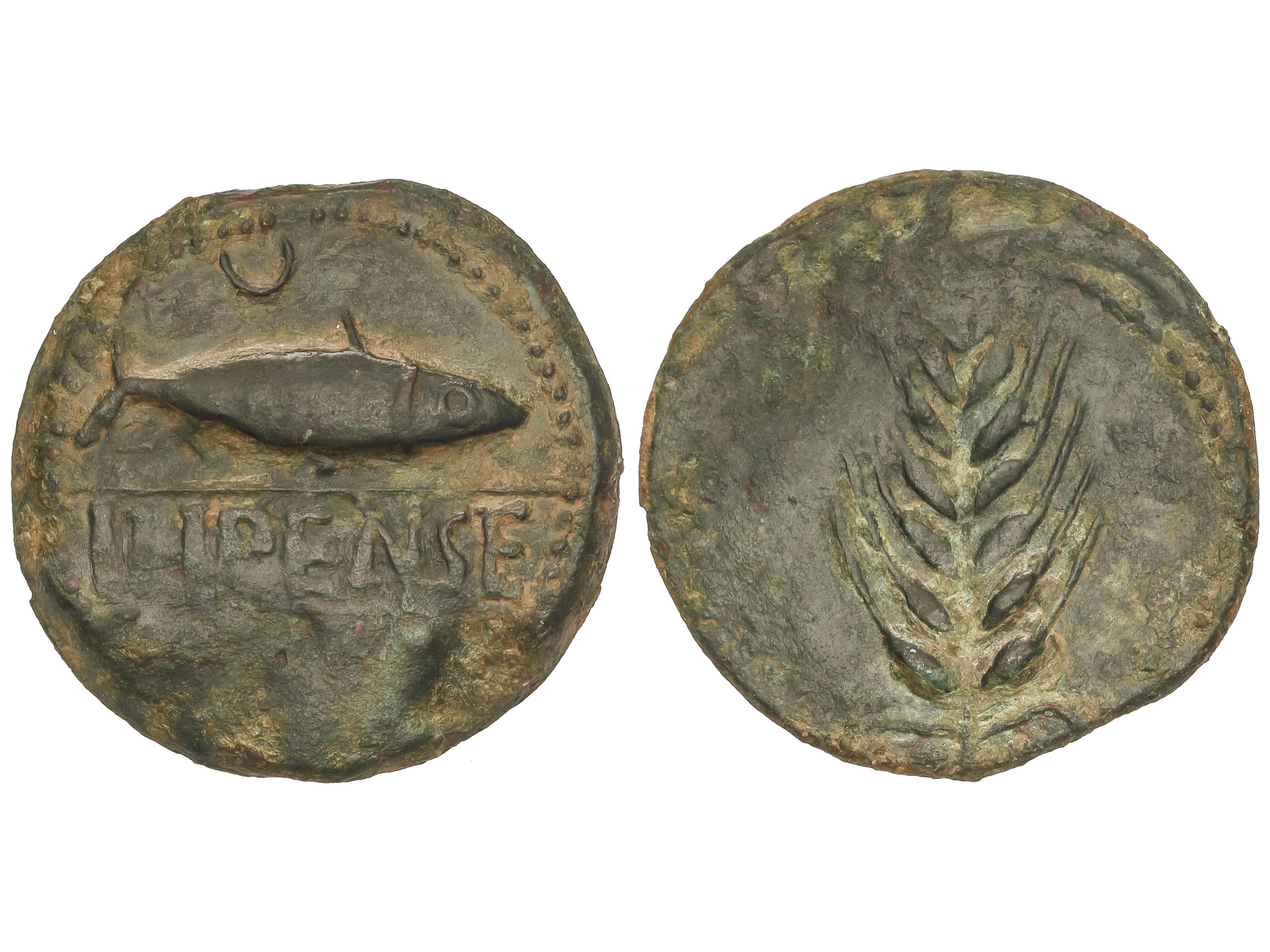 As. 120-20 a.C. ILIPENSE (ALCALÁ DEL RÍO, Sevilla). Anv.: Sábalo a derecha, encima creciente, debajo ILIPENSE. Rev.: Espiga. 19,37 grs. AE. AB-1531. MBC. (Image1)