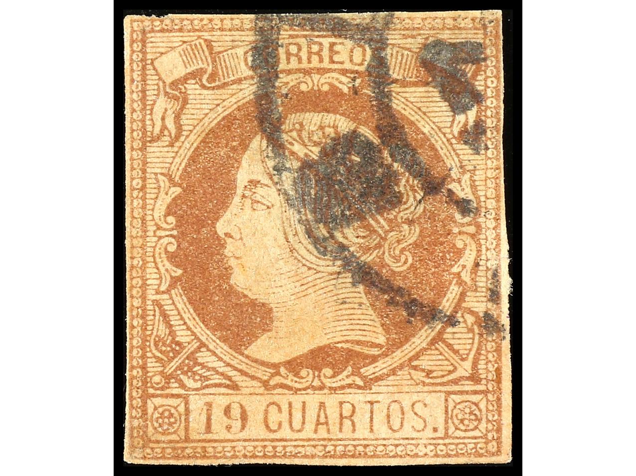 ESPAÑA. 19 cuartos castaño con Mat. RUEDA DE CARRETA 43. Dictamen CEM. BONITO. MUY RARO. Ed.54. Cat. 2.065€. (Image1) (Image2)