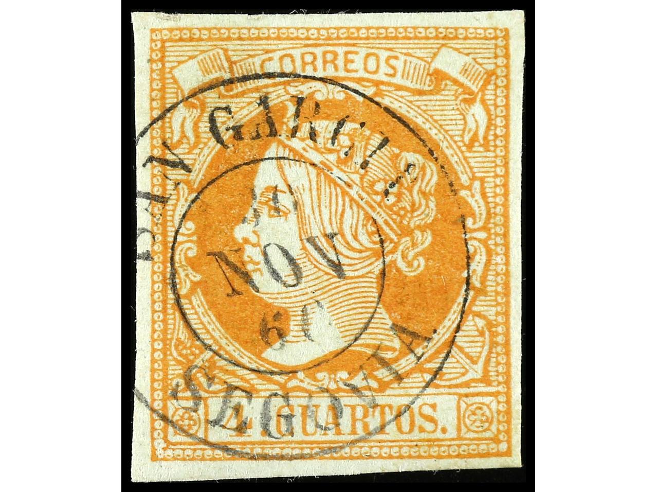 ESPAÑA. 4 cuartos naranja. Mat. fechador SAN GARCIA (Segovia). RARO y de LUJO. Ed.52. (Image1)