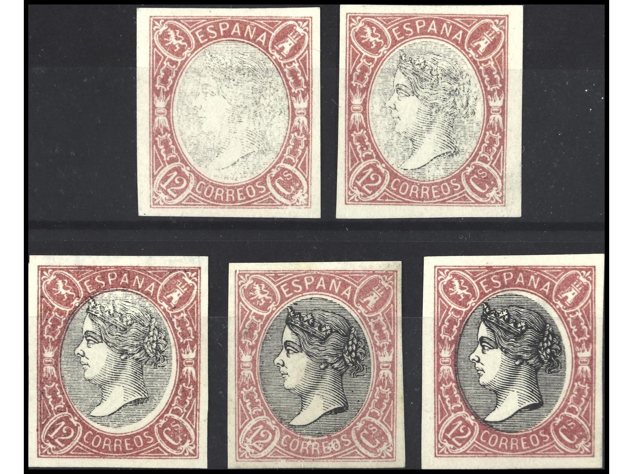 ESPAÑA. 12 cuartos. 5 PRUEBAS en tonos diferentes (Gálvez 332). PRECIOSAS. RARAS. Ed.70P. (Image1)