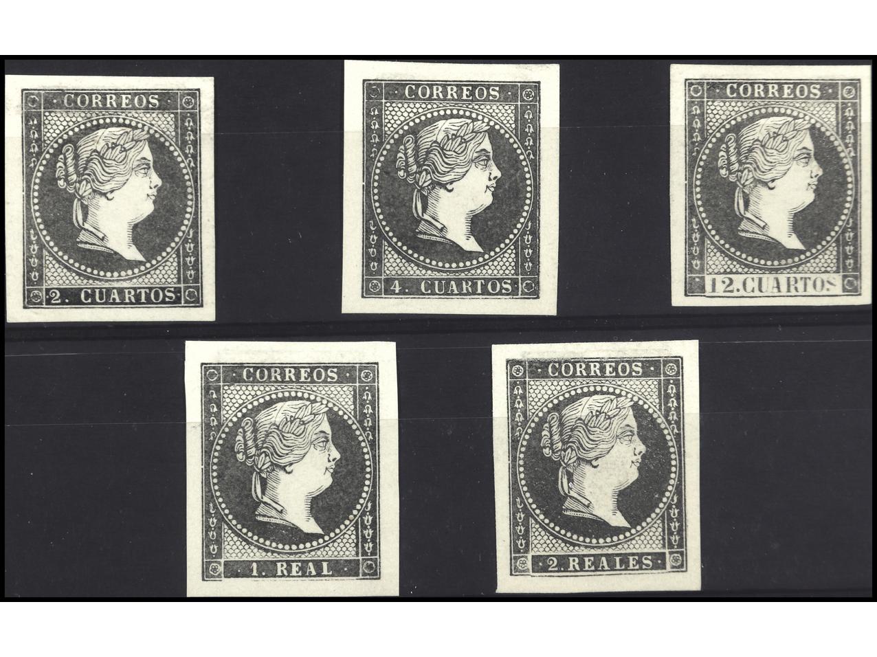 ESPAÑA. SERIE COMPLETA más NO EXPENDIDO. PRUEBAS EN NEGRO con grandes márgenes (Gálvez 201/5). Precioso conjunto. MUY RARO. Ed.47P/50P + NE1P.